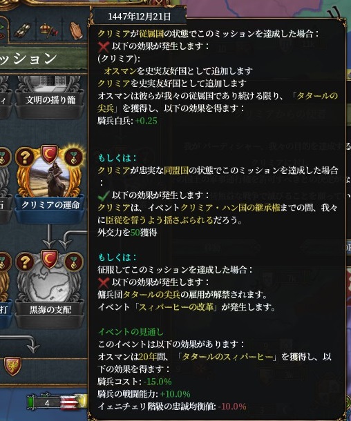 ミッション「マムルークの打倒」のためにマムルークからシリアやパレスチナの5州を手に入れる必要がありますが、属国移譲にすることで戦勝点コストを低くし、次回までの停戦期間を短くしています。