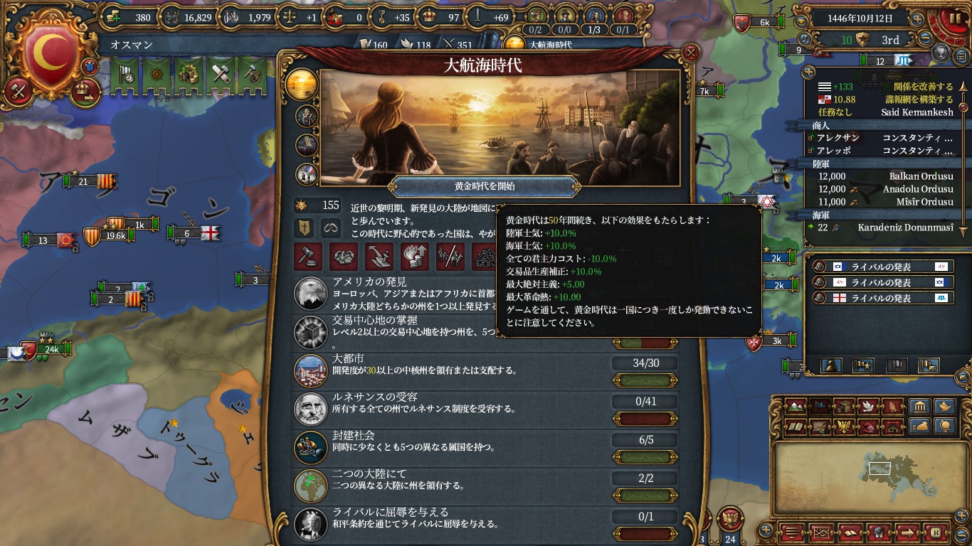 時代目標が3つ達成しているので黄金時代を発動。