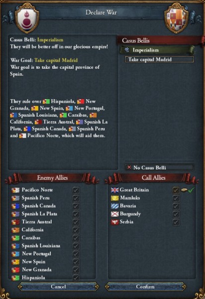 スペインはアフリカにも広大な領土を持つため、先に和平しておかないと戦勝点が貯まりません。