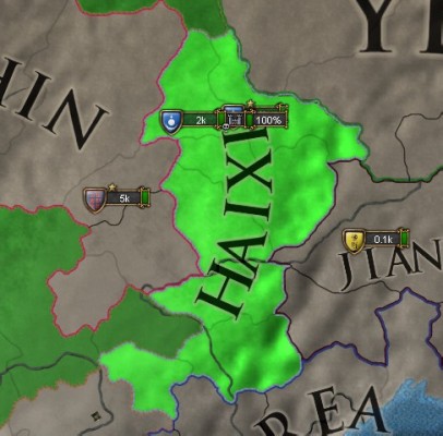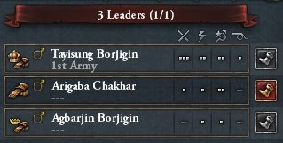 最初からいる6Kの部隊は一直線にオイラートの首都Kobdoに向かう一方、Tribesから招集した騎兵はバラバラに各地の占領に取り掛かります。オイラートの部隊はチャガタイの兵を避けてモンゴル領に進入してきますが決して戦ってはいけません。こちらを上回る兵力に加えて、白兵5・移動5という化け物じみた将軍が率いています。騎兵が1~2部隊消されるくらいは許容範囲。主力を守るための囮になったと考えましょう。