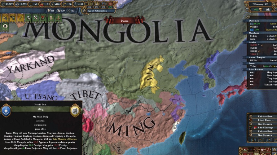 結局はモンゴルのままで可能な限り勢力を拡大するというのが実際のプレイになりましたし、結果論その方向で合っていたので、