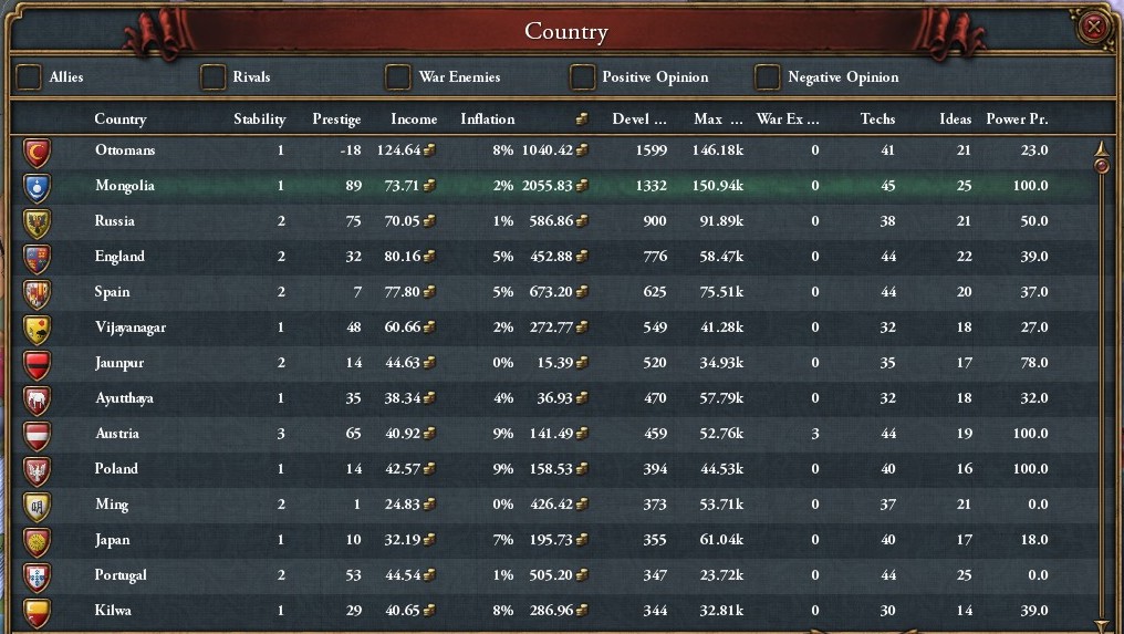 国力。収入はオスマンが抜けています。技術はモンゴルが最先端。