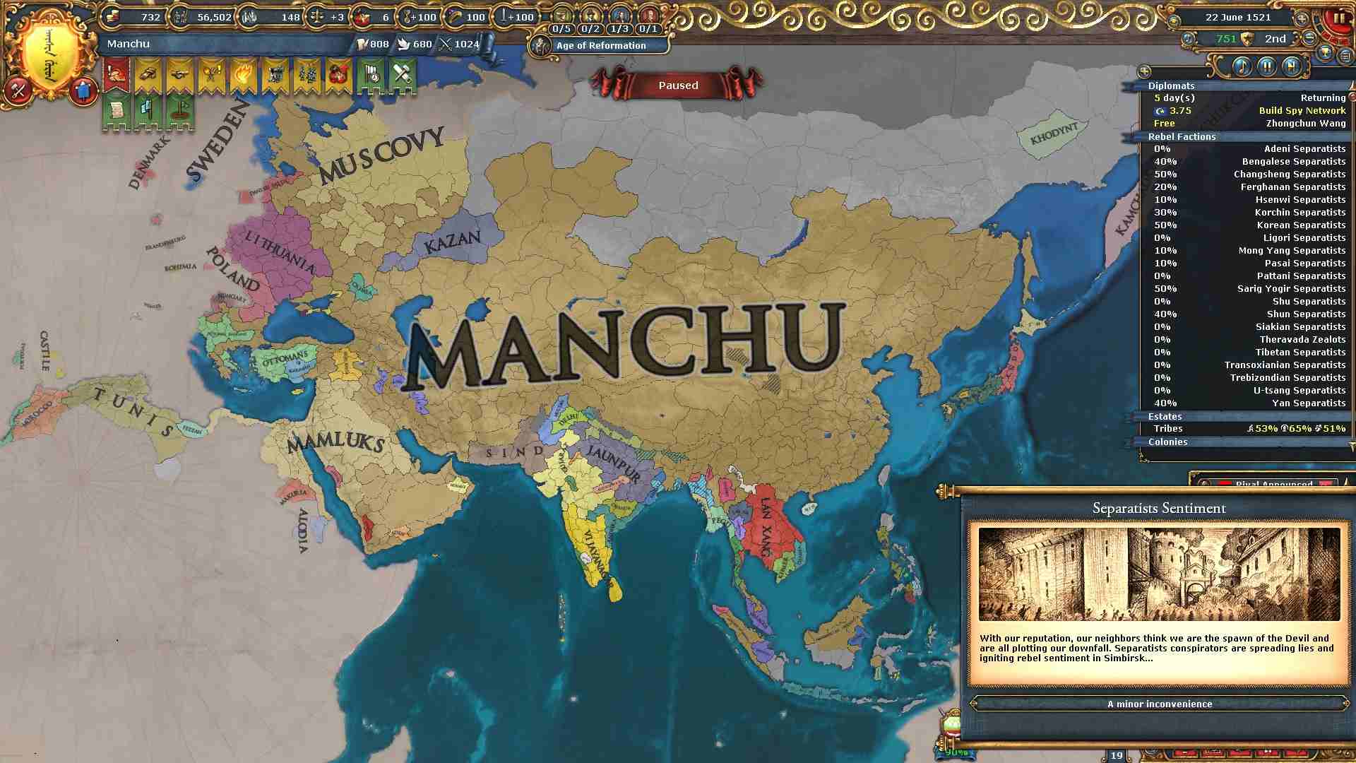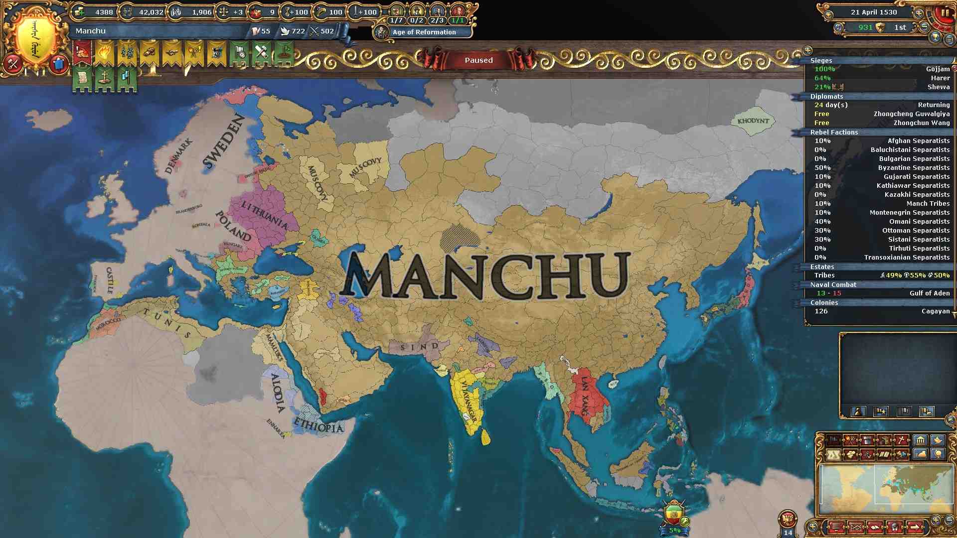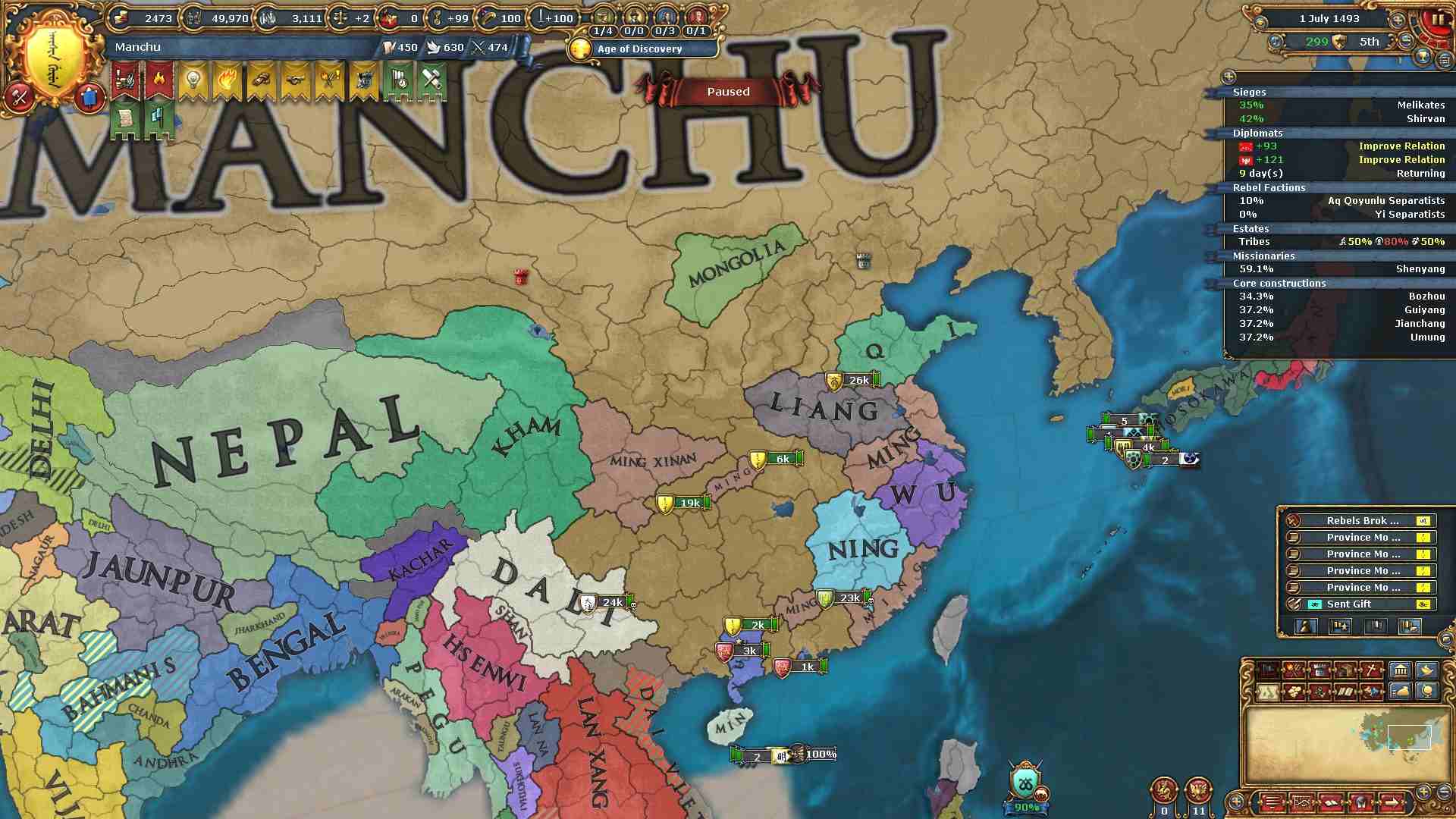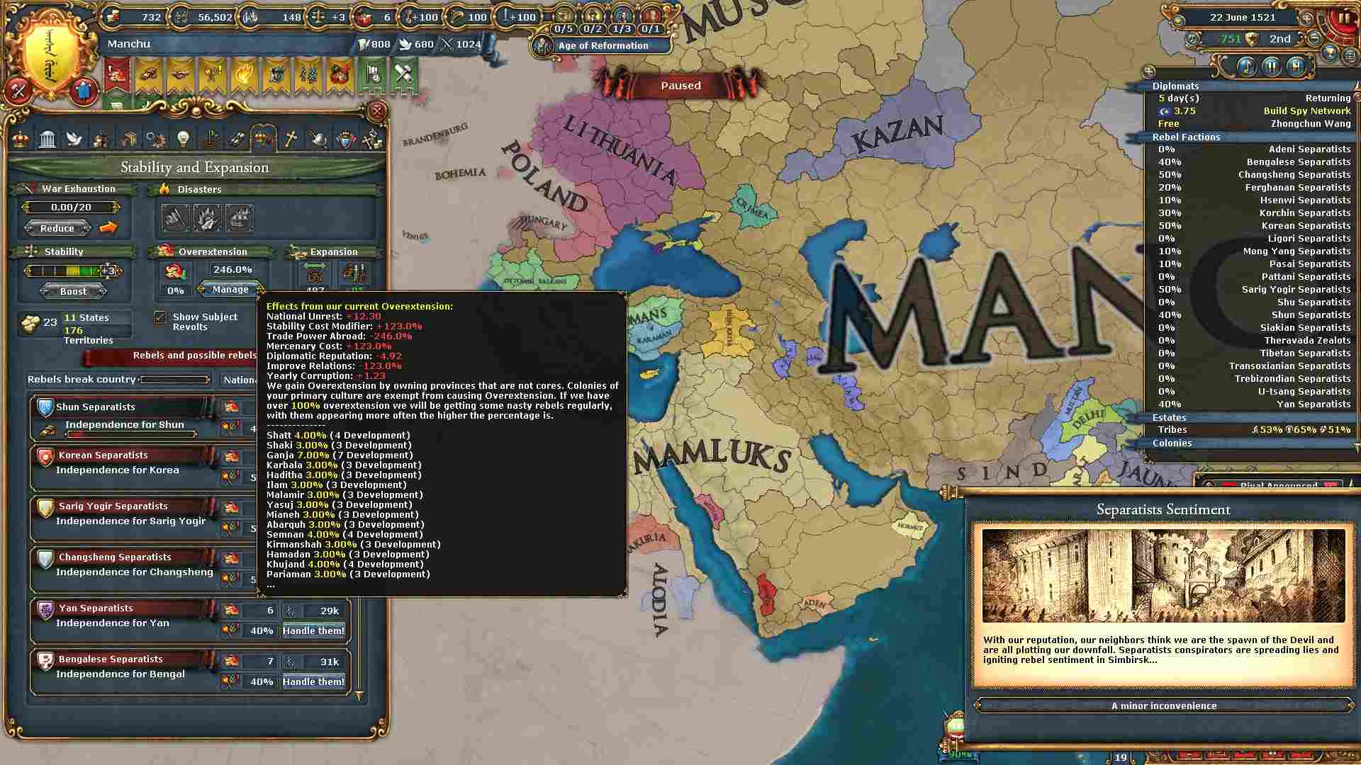 反乱軍がポコポコ生まれますが自治度上げや鎮圧部隊で乗り切ります。