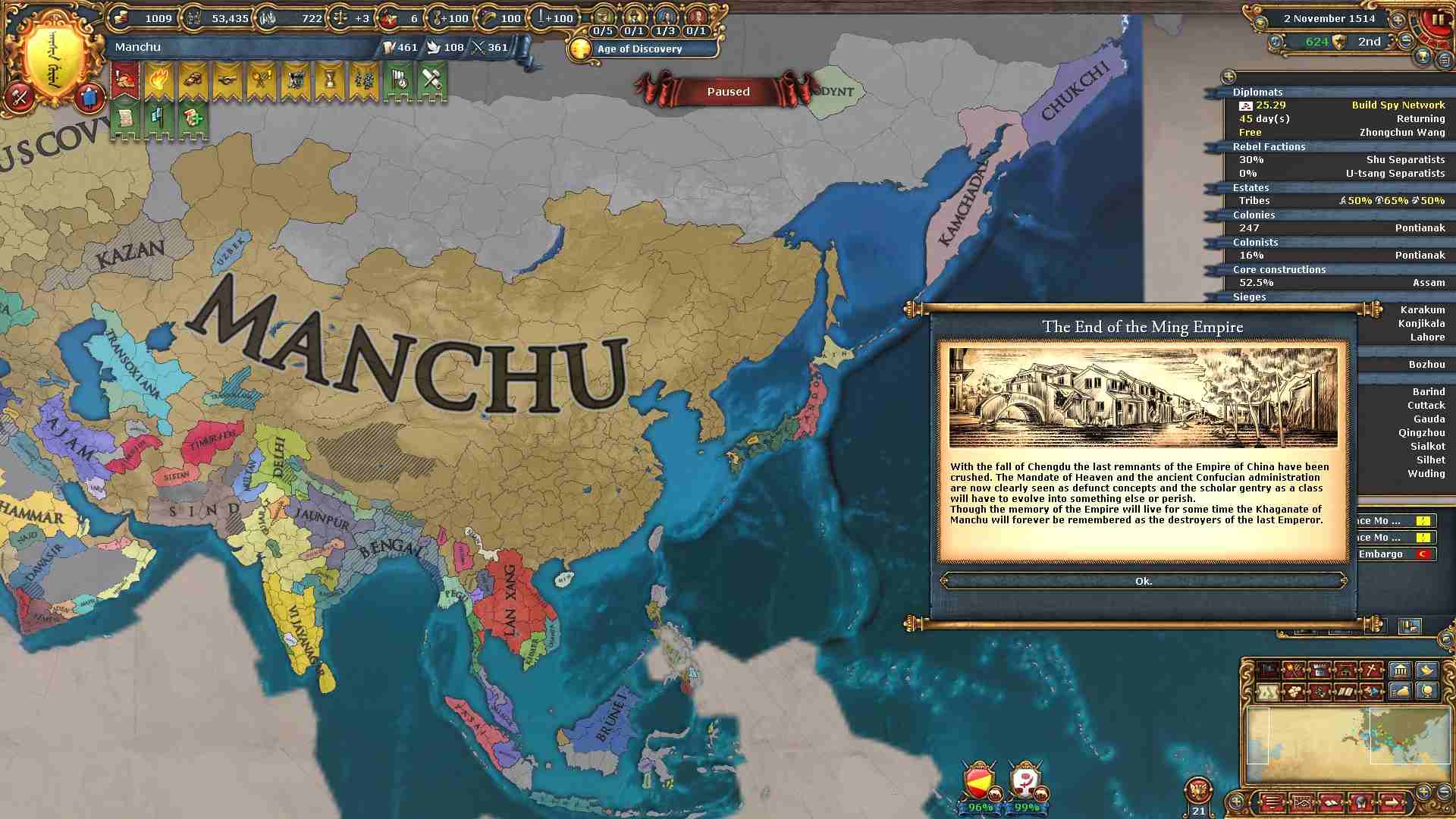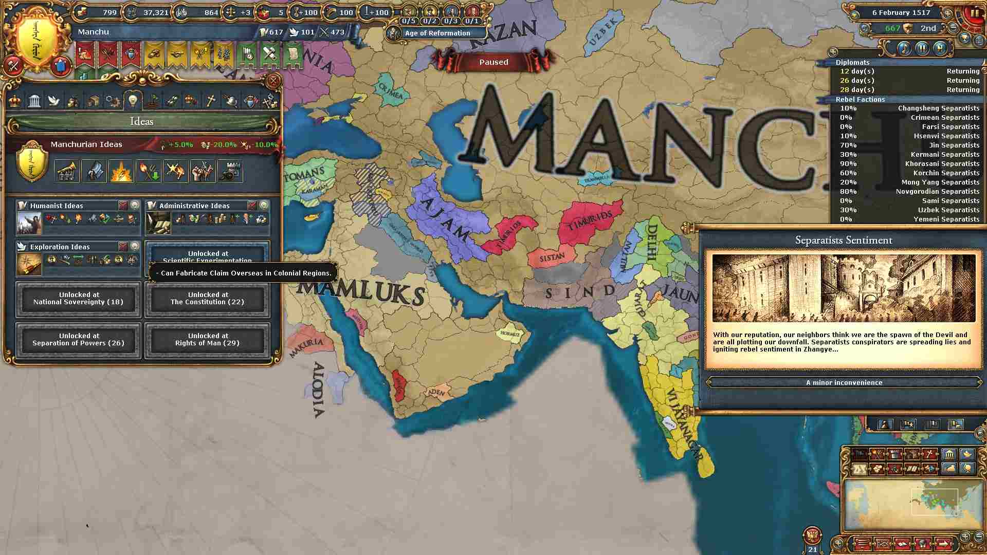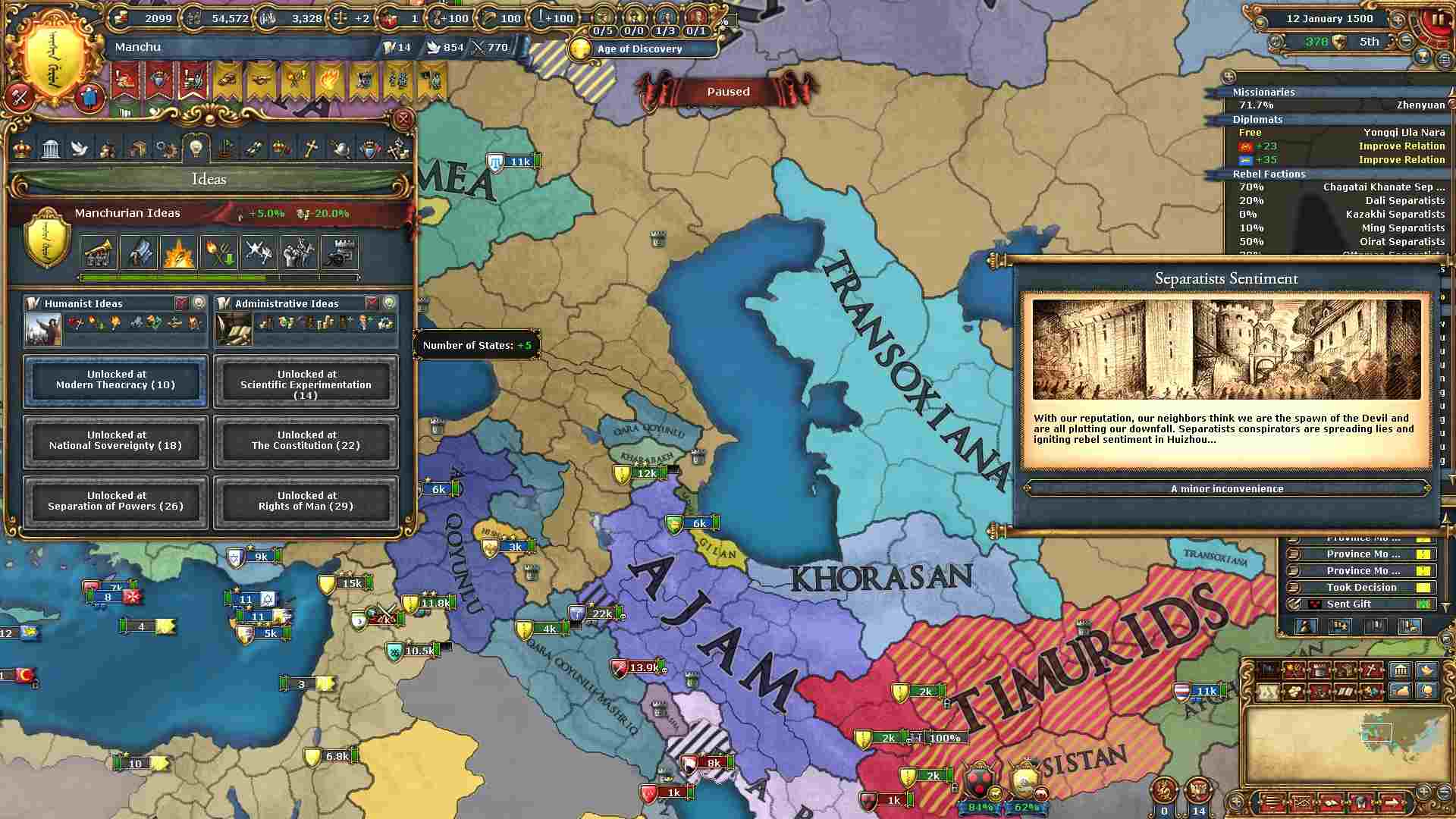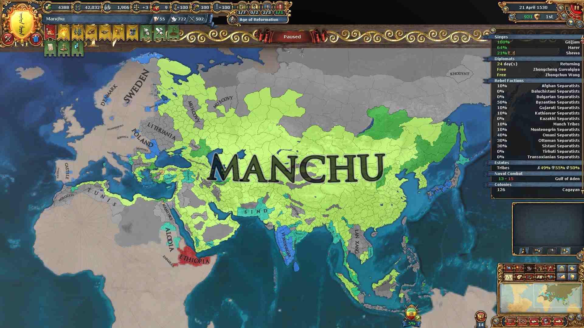 反乱軍がポコポコ生まれますが自治度上げや鎮圧部隊で乗り切ります。