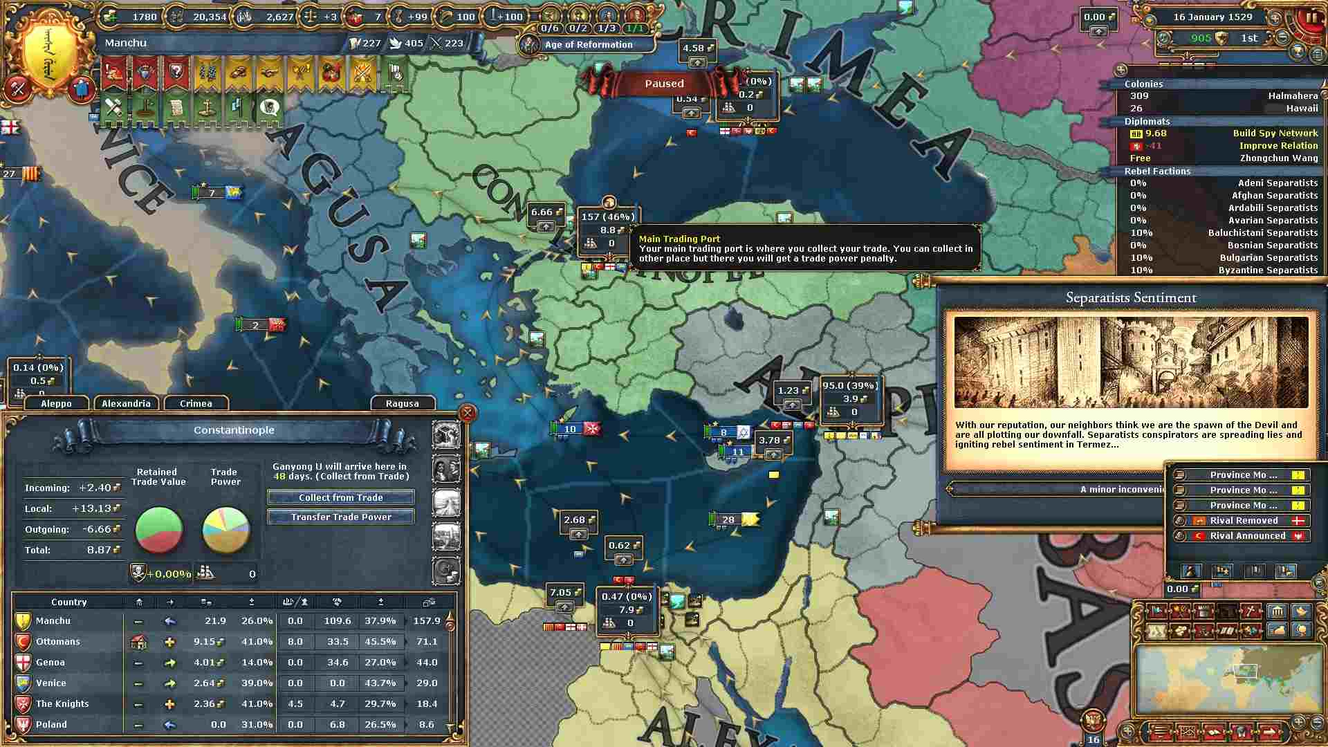 収支の改善の為、メインの貿易港をコンスタンチノープルノードに移しました。