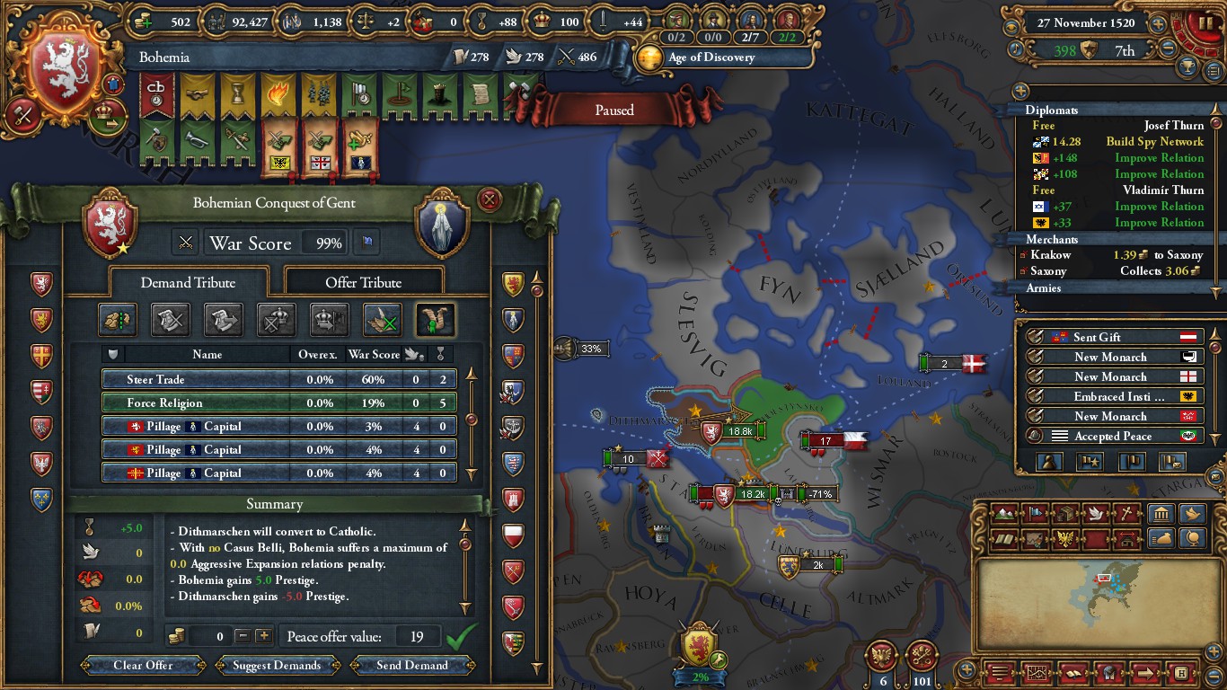 戦争は戦力差で圧倒し、ビザンツとEretnaのコアを返還してもらった。