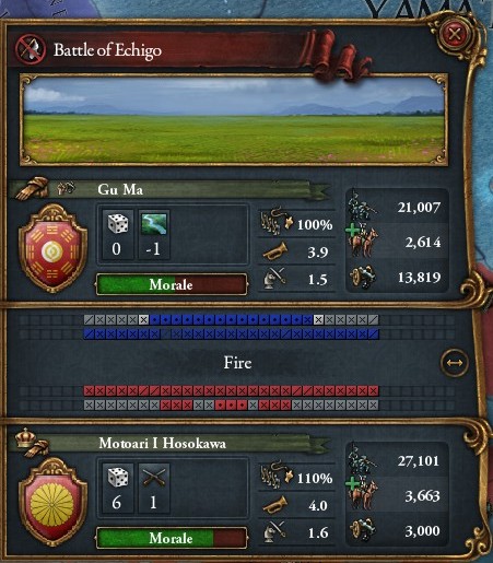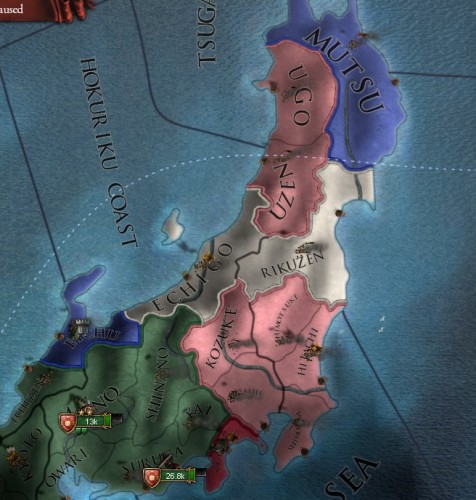 1518年、貞心は細川幕府の傘下にあった小笠原氏に宣戦します。Nipponトレードノードにおける影響力の増大を狙った侵攻でしたが、戦乱の中で鍛えられた大名達の軍勢は想像以上に頑強な抵抗を示します。4年にわたる戦いの末に朝鮮は3州を奪いますが、多数の傭兵を補充せざるを得なかった朝鮮の財政は一時的に悪化しました。占領地にこれ以上兵を割くことを嫌った貞心は、上杉氏の末裔にこの3州を与えて統治をゆだねました。