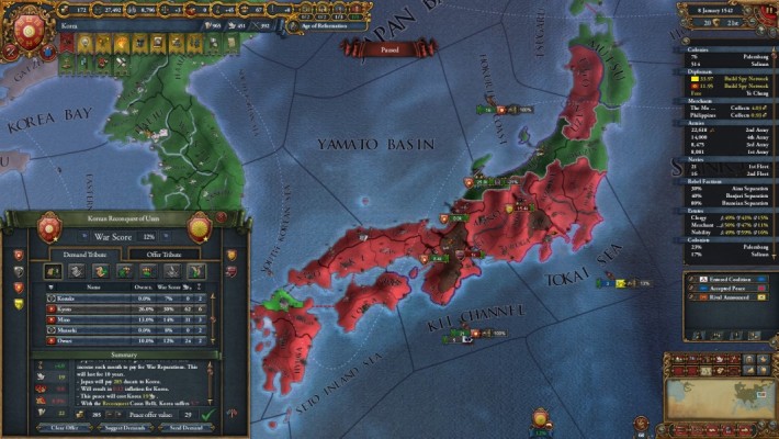 朝鮮は西岸の豊かな2州と457Dの賠償金を得るとともに、ブルネイに滅ぼされていたクタイ王国を復活させ、将来の東部侵攻への足掛かりを築きました。