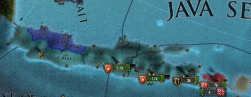 さらに1530年、貞心はボルネオの南、ジャワ島に目をつけます。マジャパヒト王国をバリ島に追いやったスンダ王国が治めていたジャワ島は、ボルネオ以上の繁栄を謳歌していました(当時ボルネオ全島のDev合計149、ジャワ島は173)。ジャワ海を超えた朝鮮軍はスンダ王国軍を圧倒、交易中心地に加え多額の賠償金を奪います(637D)。