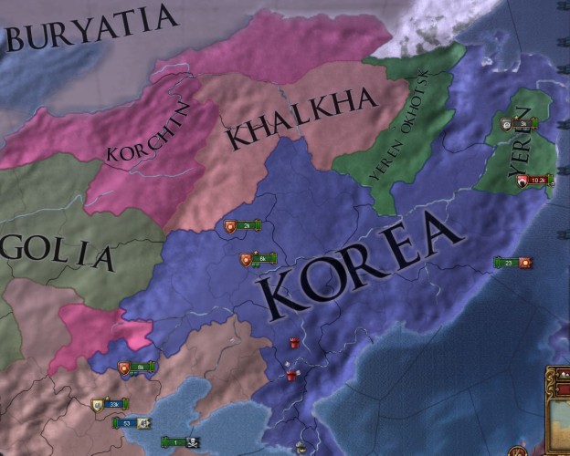 その後軍政を改革して連戦を可能とする動員力を確保すると(Quantityアイディアを取得)、1492年にホルチン部を攻めて2州を獲得、翌年には軍を転じて再び野人女直に侵攻、2州を割譲させました。さらに1506年、ホルチン部から独立たハルハ(KHALKHA)を攻めて属国としました。