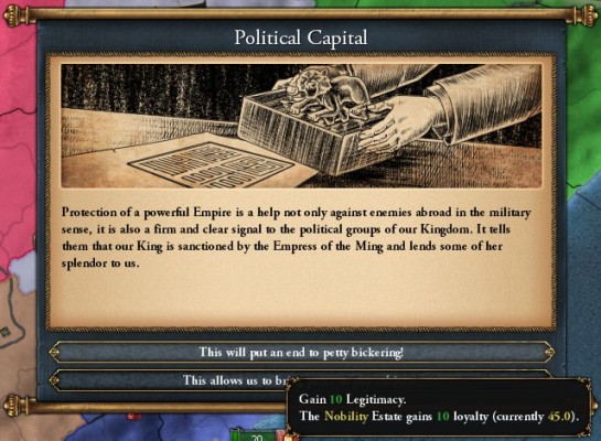 永昌は己の支持母体となった武官を厚遇し(Strengthen Governmentの実施)文官を中心として根強かった反発を力で抑え込むとともに、宗主国・明には様々な貢物を送り、王権の正当性を認めるよう働きかけました(イベントPolitical Capitalが2回発生)。