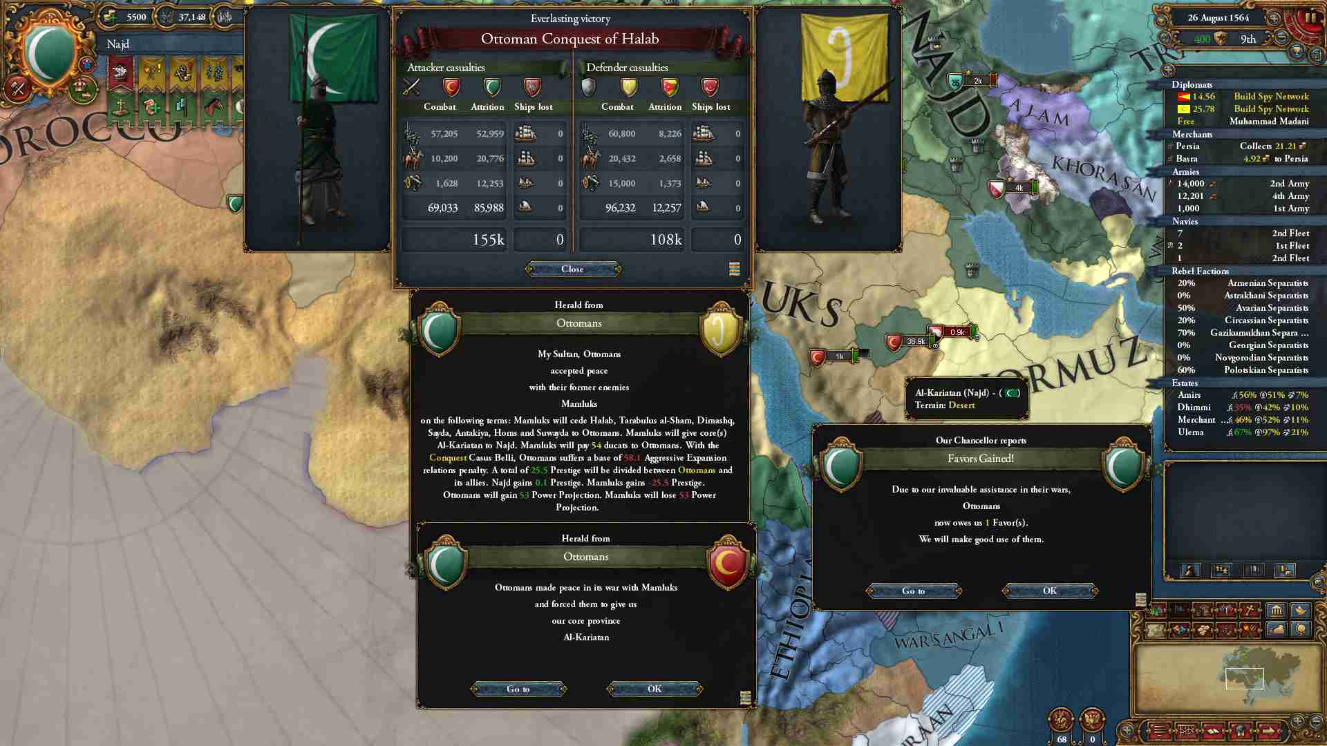 1546年9月 終戦(3州+金銭+Circassiaのライバル解除)。Great_Horde領内に沸いた部族反乱の相手が面倒だったので完全併合はしなかった