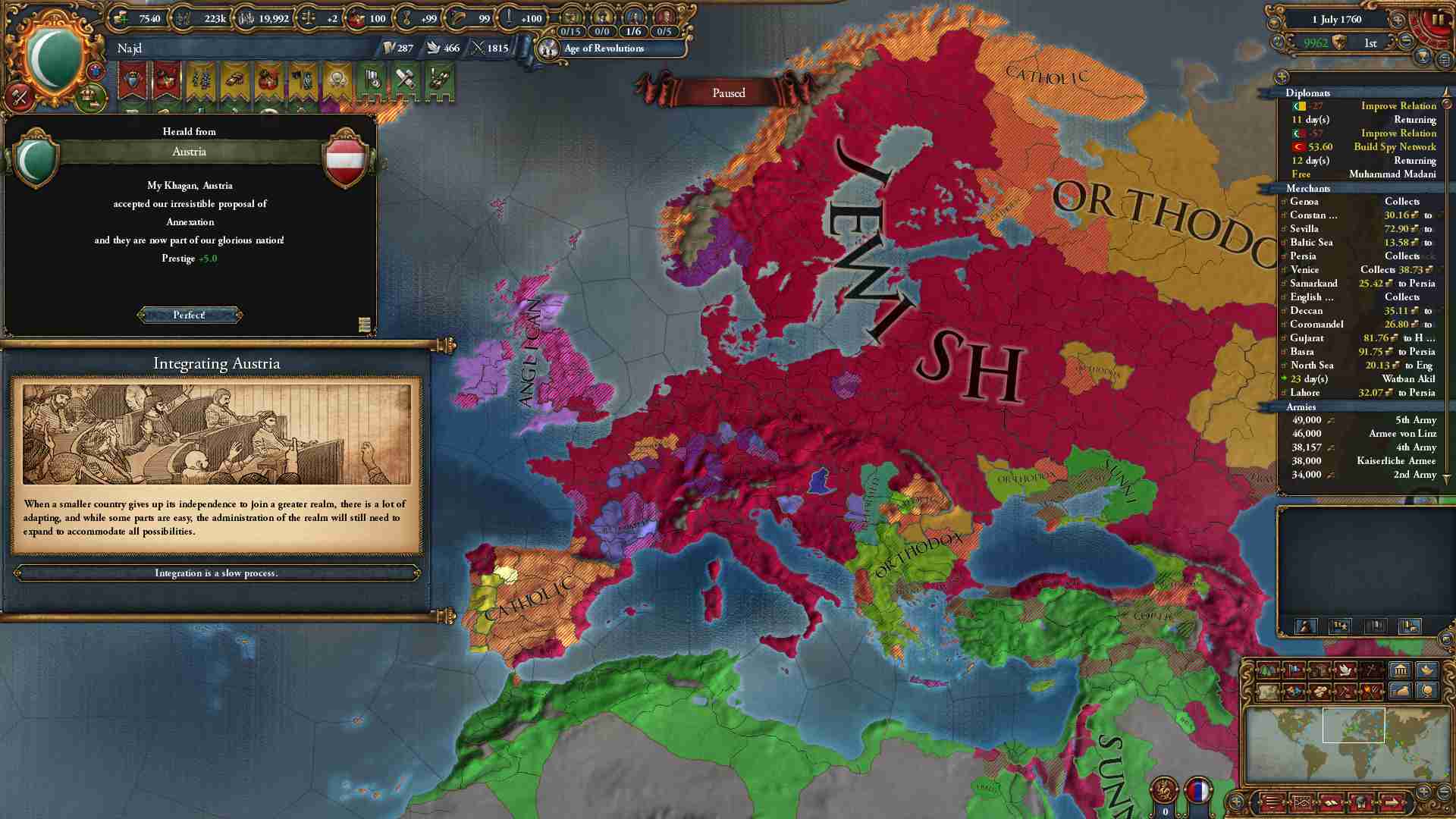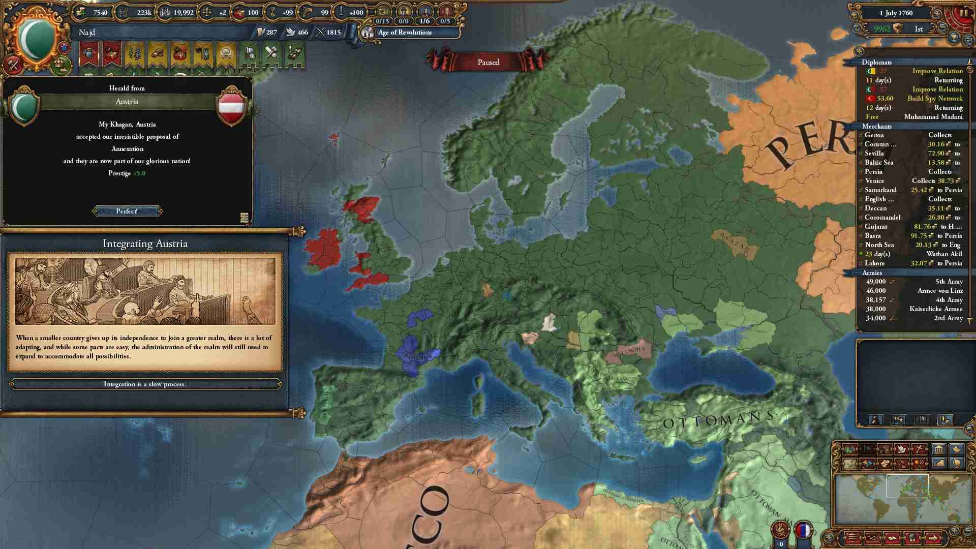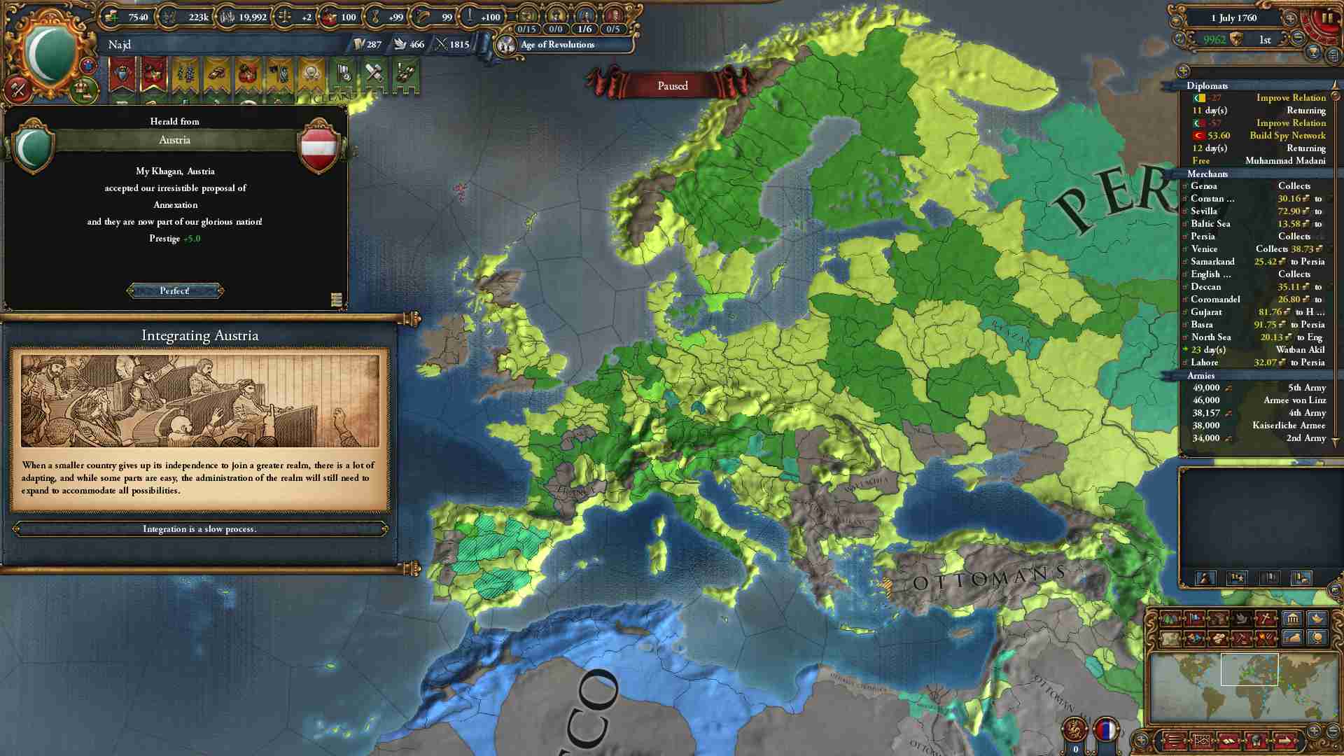 | 1760/07 | Austriaの外交併合完了 | 欧州の残りは敵と朝貢国(つまり敵)のみ | ||