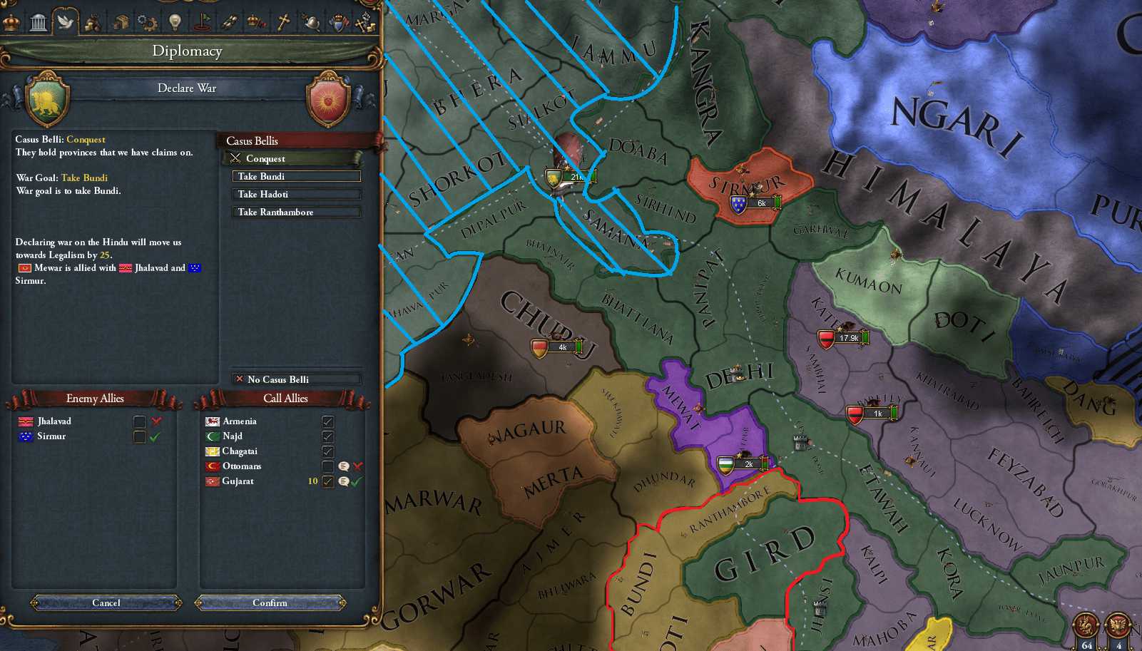 1486/11 Multanに宣戦布告し、Gujaratに参戦要請。敵同盟のMalwaが裏切り、Nagaurを共戦国に指定(Nagaurの同盟Mewatも参戦)