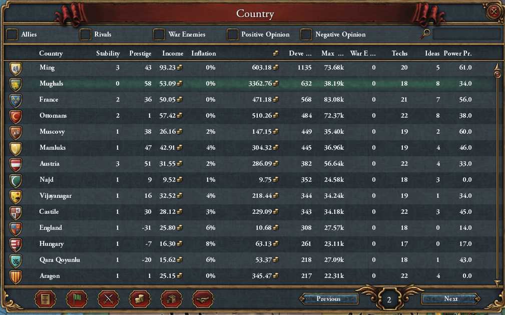 Najdを除けばいつものメンバー。最近自国がおかしな挙動をする世界線ばかりに浸かっているせいか、順当過ぎて逆に珍しく感じる。 Najd以外の従属国はAragon(Castileの同君下位) 2番目のアイデアは"統治"を選択。ポリシーの外交併合コスト削減狙い。Mughalsの伝統(1回目の変態時はNIを変更している)もあり、 統治アイデア②取得後はコア化コストが格安で済んだ。特に恒久的請求権のついた州を獲得した場合は統治効率0%にも関わらず"必要ADM=DEV値"だった