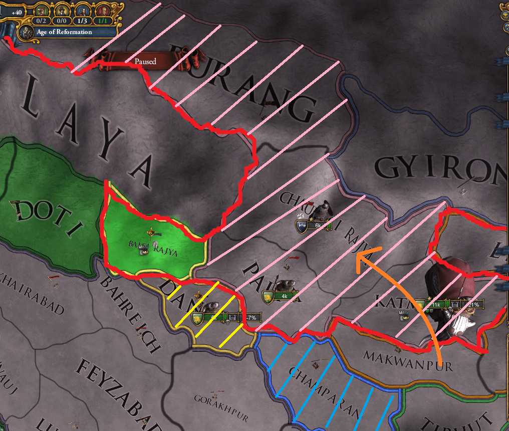 ややこしいが先ほど講和したのは中央の紫のMewa"t"。開戦したのは左下に広がる黄土色であるMewa"r"。中央上の橙色がSirmur 戦争目標はGirDエリア(赤線)に属する3州を獲得し、ミッション5-1達成に近づくこと 青斜線部はNajd領。