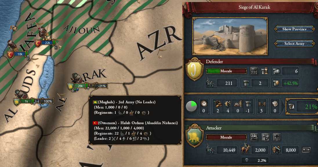 (主にOttomansの)犠牲を厭わず突撃を命じたものの、残念ながら1月後(右)にこちらの士気が先に尽き20k以上の尊い命が失われた 私輩の指配が失敗し♪でっかい後悔夢も至灰 視界を死体が支配し♪すっぱい香塊胸を占肺 遺骸と遺灰で慰碑はいっぱい♪崩壊これが超心配 意外の囲敗で死海にグッバイ♪老獪それも無問題