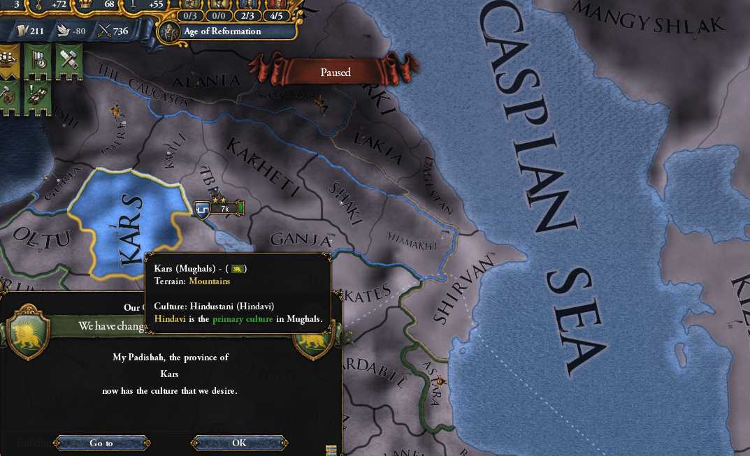 属国 Chagati Kilwa 同盟 Ottomans Malacca Lan_Xang 外交枠超過状態(+1)。気になった点として受容文化枠の表示が4になっている 同化済みの文化はもっと多いが、主要文化のヒンディーを除いたヒンドゥスタングループが4つなのでこれらのことだろうか?