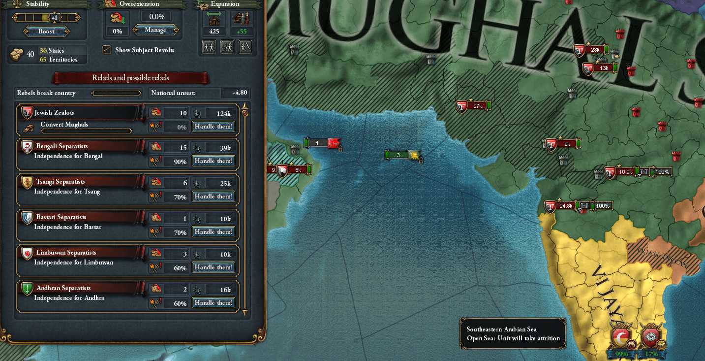 前から疑問だったのだが、反乱勢力にも陸軍伝統は適用されるのだろうか?(規律は発生国のそれが適用されるらしい) あまり有能な将軍が率いているところを見たことがないので、仮に適用されていたとしても勢力ごとの値だとは思う 確認手段がないし知ったところで何か行動を起こすことはないが、陸軍伝統100の狂信者とか凄そう