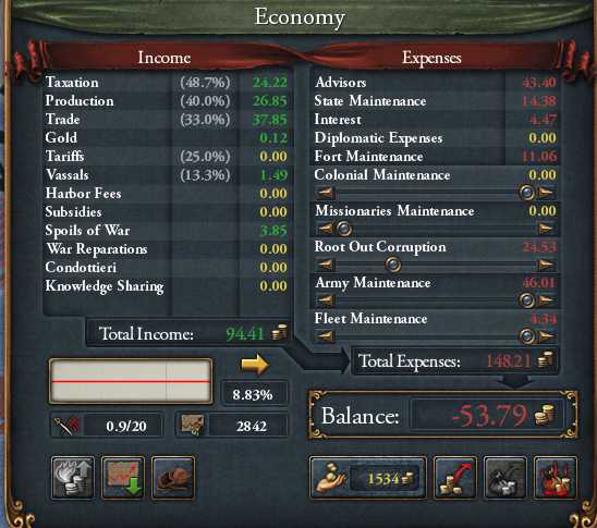 能力値は同じだが、"Indulgent"(大雑把=交易効率-10%)であり、 黒塗りが広がり税収等が落ち、交易収入が重要な時期だったので結構痛かった。
