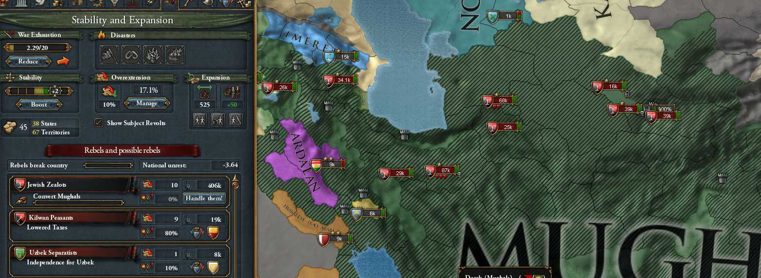 Chagataiが1州だけ請求権を持っていたが、そもそも今Russia領はそこまで必要ないしDIPがもったいないので 目標はPP稼ぎと講和内容の"Show_Strength"(力を示す=各君主点+100)