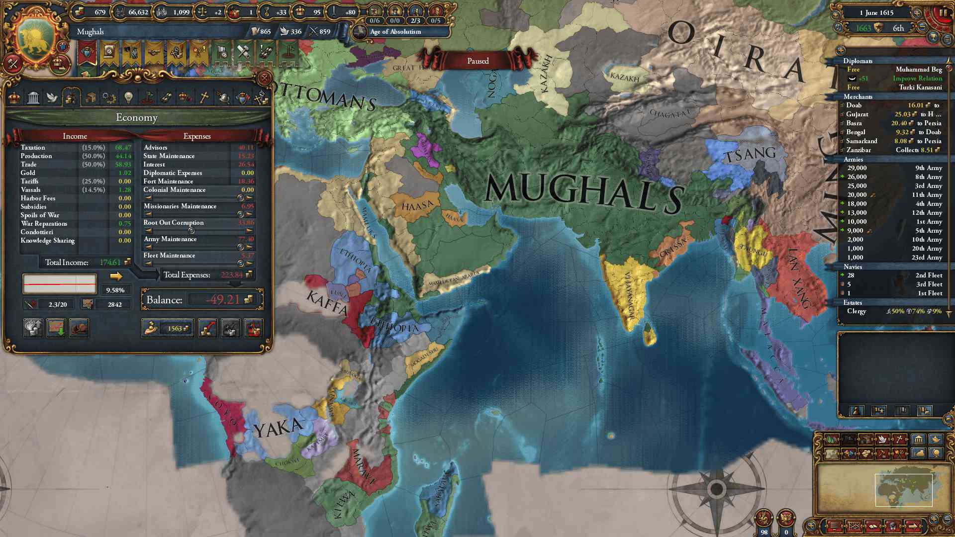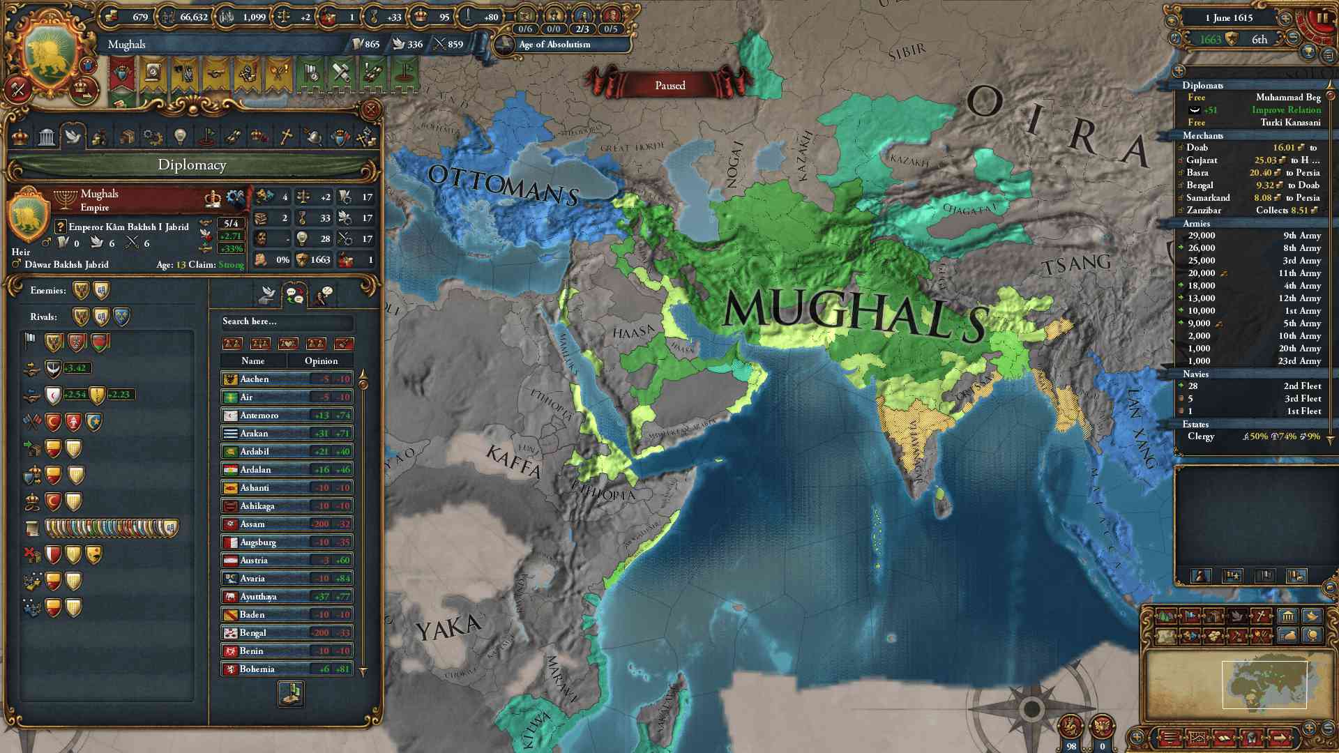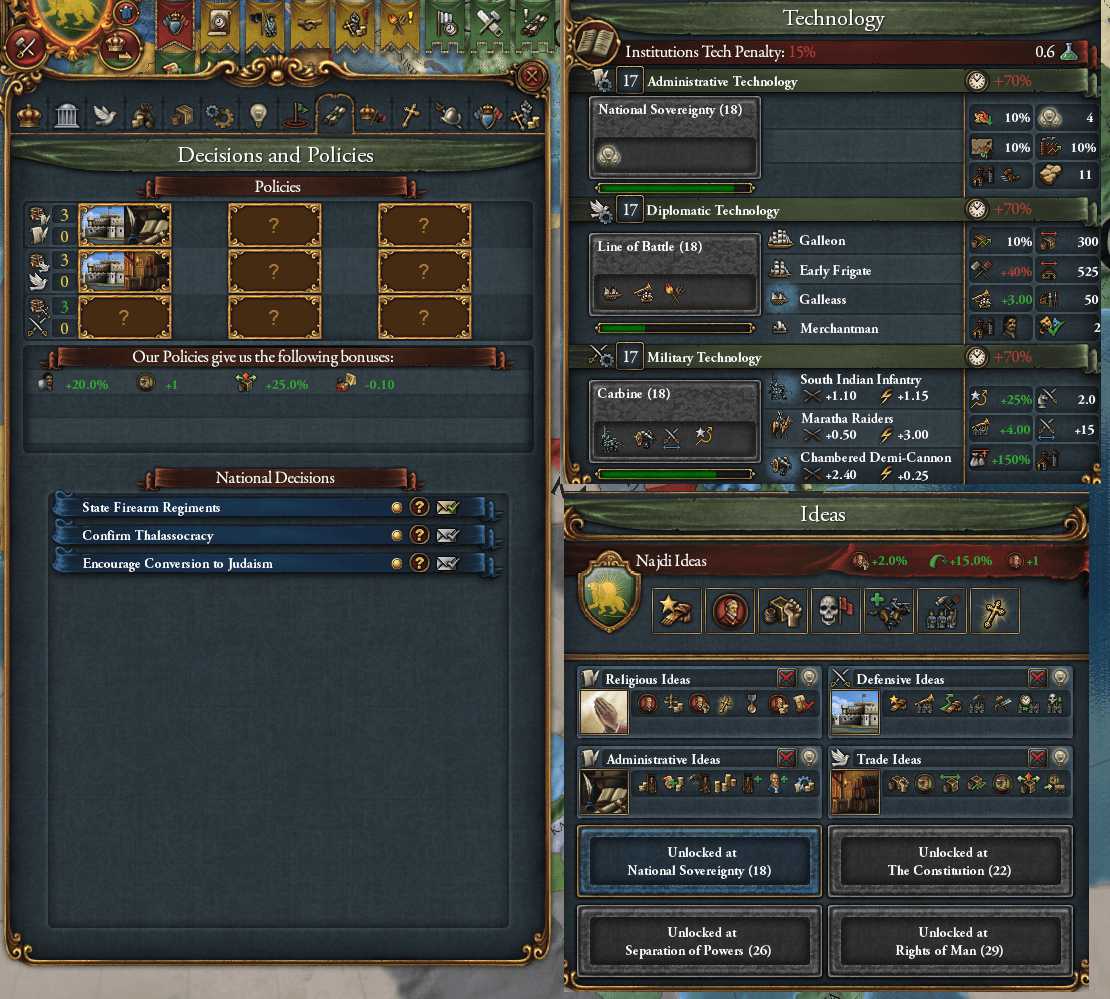 この時期にはヒンドゥスタン文化グループの同化ボーナス(コア化コスト-10%)も獲得済みで、ADMにはそこまで困っていなかった 交易アイデアの次も外交系の諜報アイデアを取得予定だったので、ある意味理想的な後継者