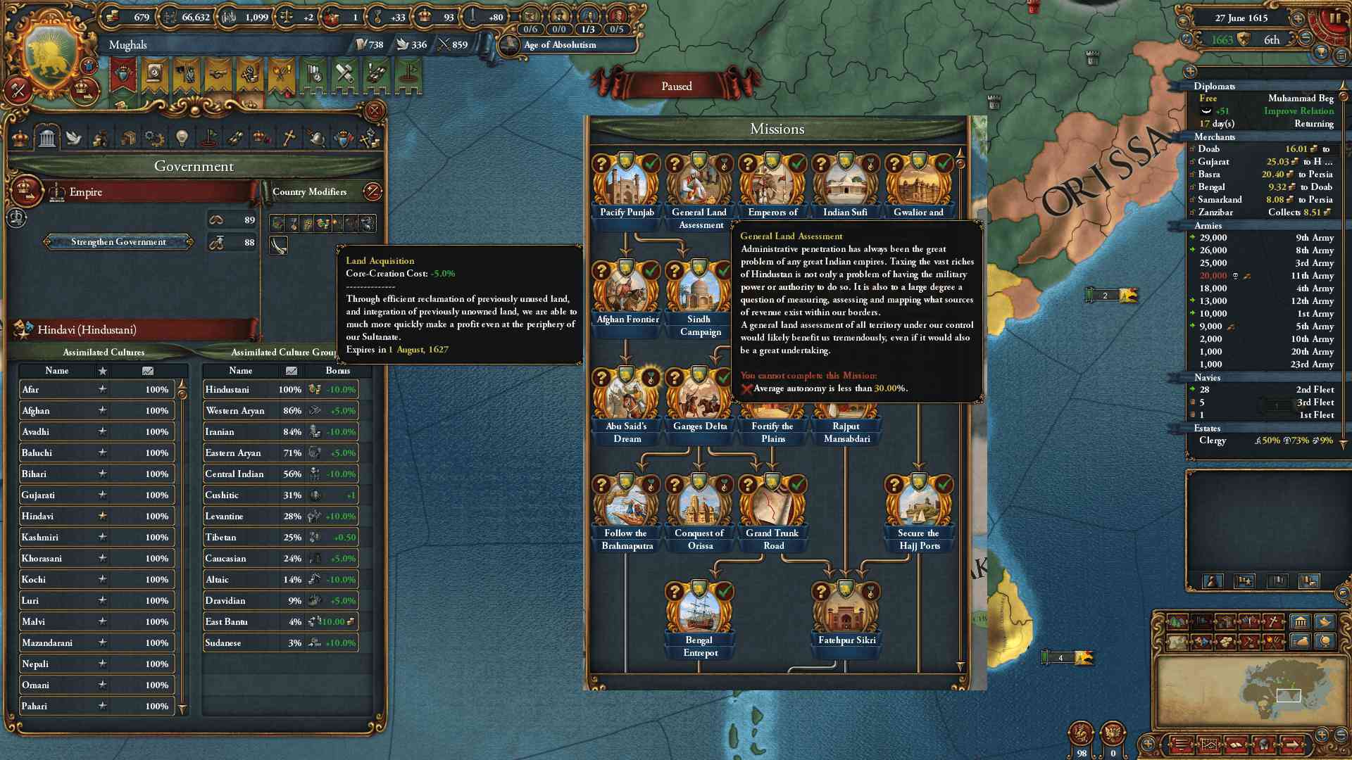 インド・スルタン国ではなくなったが、課税政策の効果はあと12年継続してくれるらしい 同化済みの文化グループはまだヒンドゥスタンのみ。インド各地とクシのボーナス獲得を急ぎたい ミッション2-1"一般的土地評価"の説明文で隠れている2~3段目と5-6は達成済み