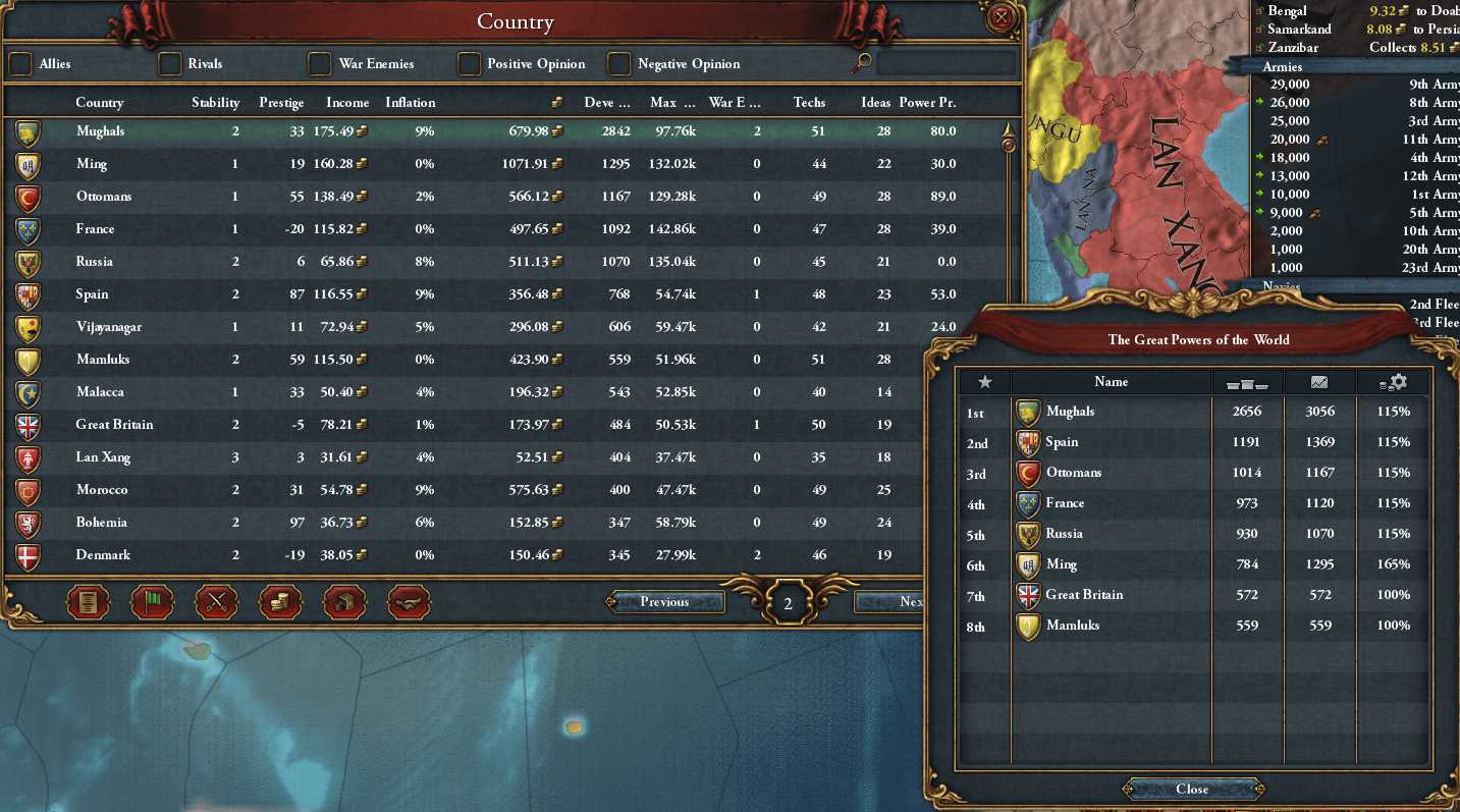 特に波乱はない。Lan_Xangが健闘しているぐらいだろうか 内政(建築)を怠けているのでDEVの割に収入が低い。世界一の交易ノード(ペルシア)をほぼ独占していたはずなのだが… Bohemiaが100近い威信を持っているので、宗教戦争はカトリック陣営が勝利したのだろう