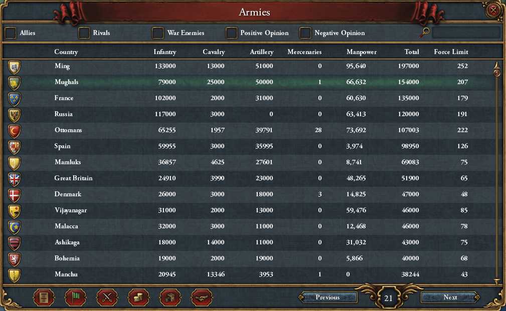 DEV合計が半分以下のMingの方が軍量が多い。殆ど陸軍関係の建築物に投資していないのが大きく影響しているのだと思う 自国が弱体化した訳でもないのに、この年代にOttomansがベスト3に入っていないのは珍しい気がする Ottomans以外で傭兵を利用している国が少ない。ここまで常備軍ばかりなのもまた珍しい 変なことばかりで不安になるが、いつも通り極端な歩兵偏重のRussiaでホッとする。歩兵だけでOttomansを超えているのだから凄い (というか維持費の安い歩兵しかいないから、Ottomansを上回る軍量を養えているのか。ひょっとしたら銃も2人に1丁かもしれない)