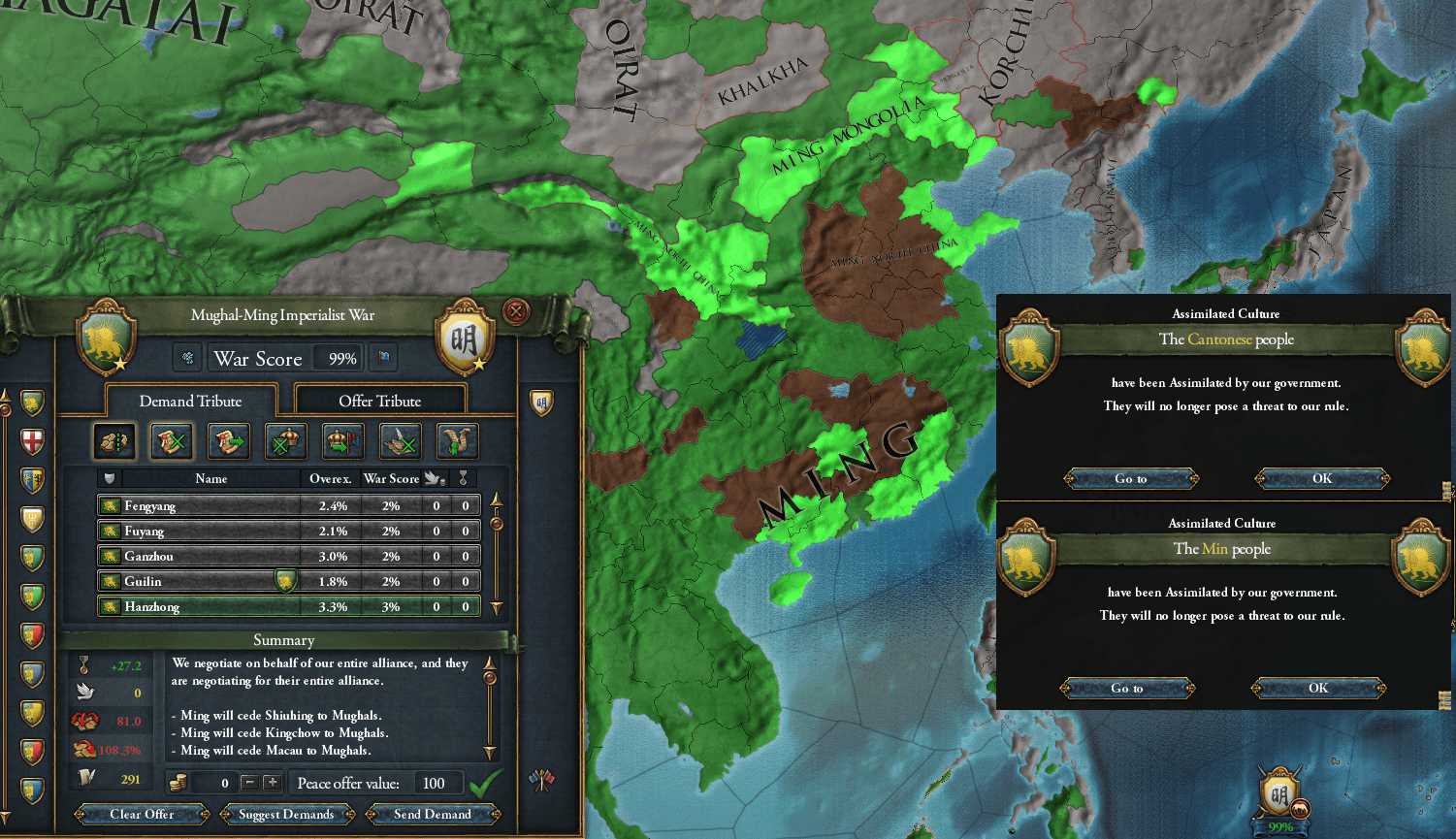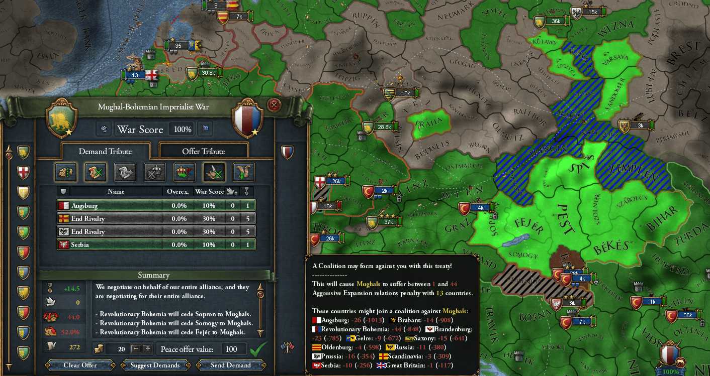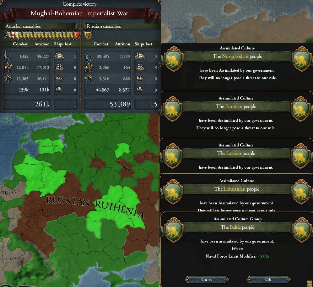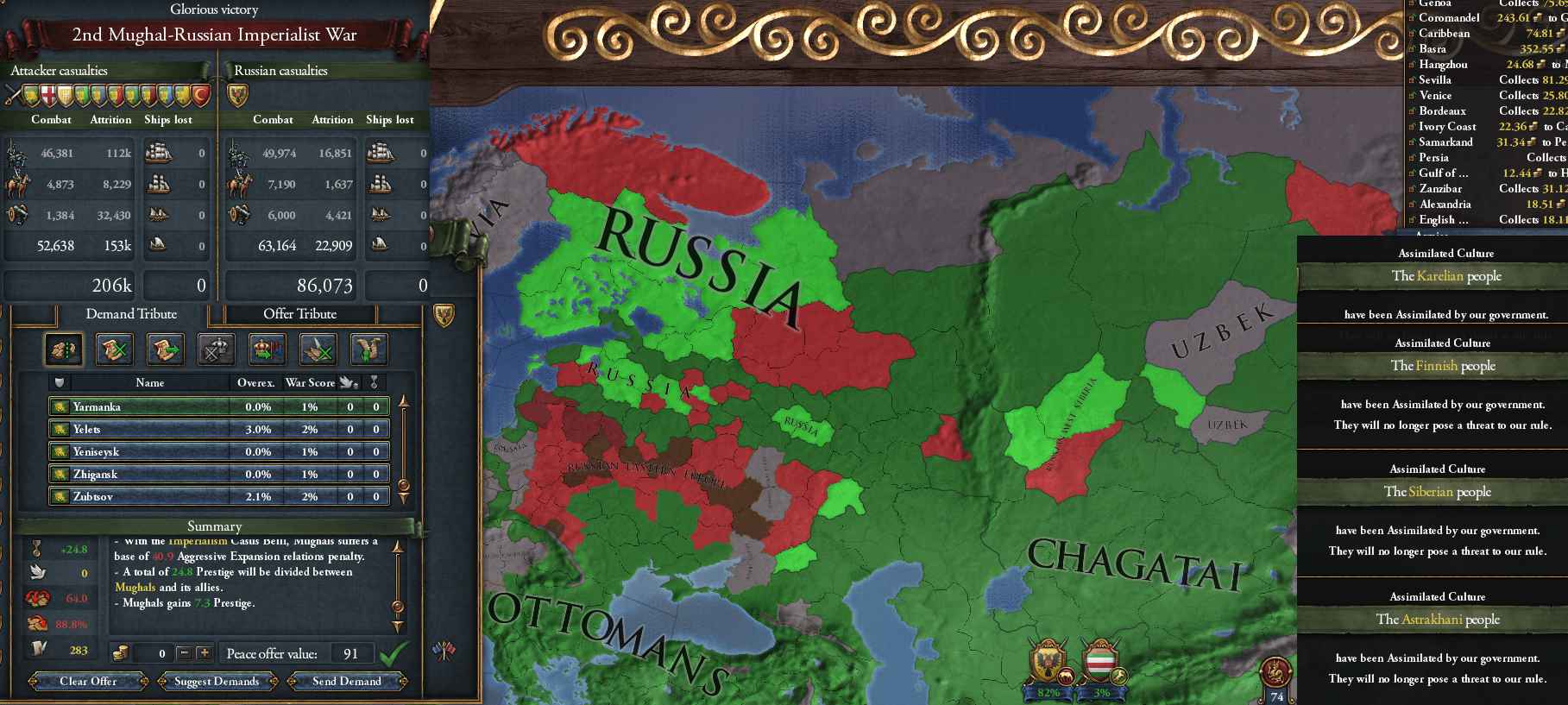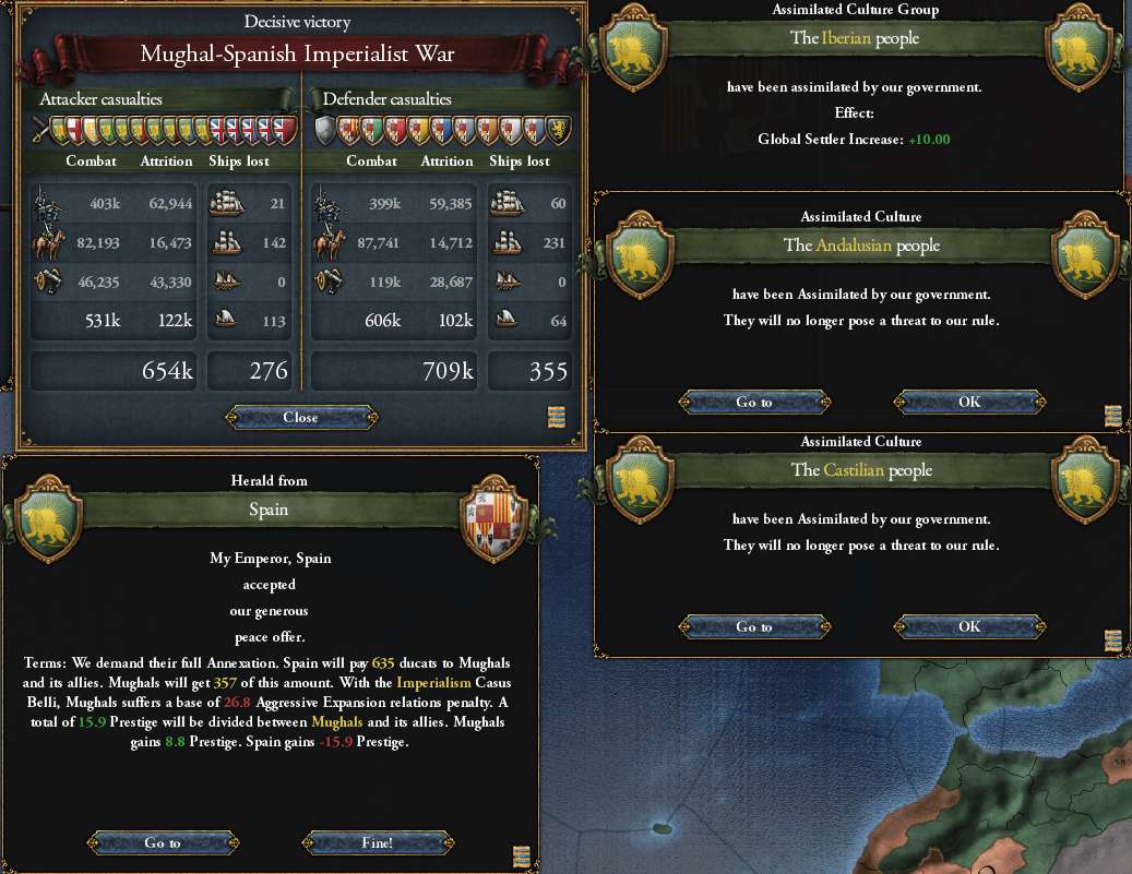 イベリア文化グループ同化ボーナスは終盤の空地埋め時に役立ってくれることだろう 植民地国家×8も引き継ぎ 今まで植民お疲れ様、君の育てた植民地は責任を持ってMughalsが活用します。 自陣営の犠牲の半分強はMughalsのもの。本国は大したことなかったが、とにかく植民地国家軍が多かった 有り余る資金で傭兵を雇ったため人的資源はむしろ増えたが、次回アプデで傭兵の仕様が変わるらしいので少し不安