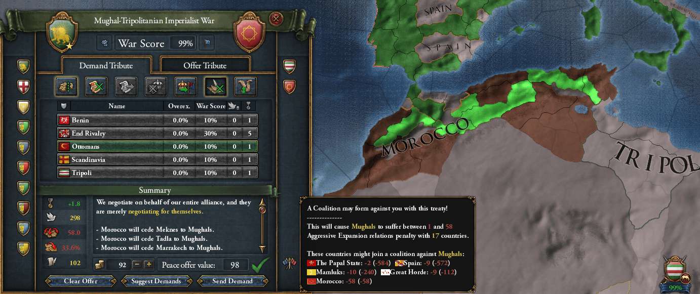 Spainを完全併合したかったが、別口でMoroccoと交戦中で2州ほど占領されていた Moroccoとは講和したばかりなので釣りだし