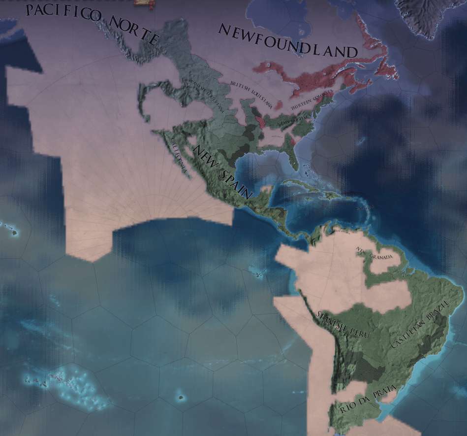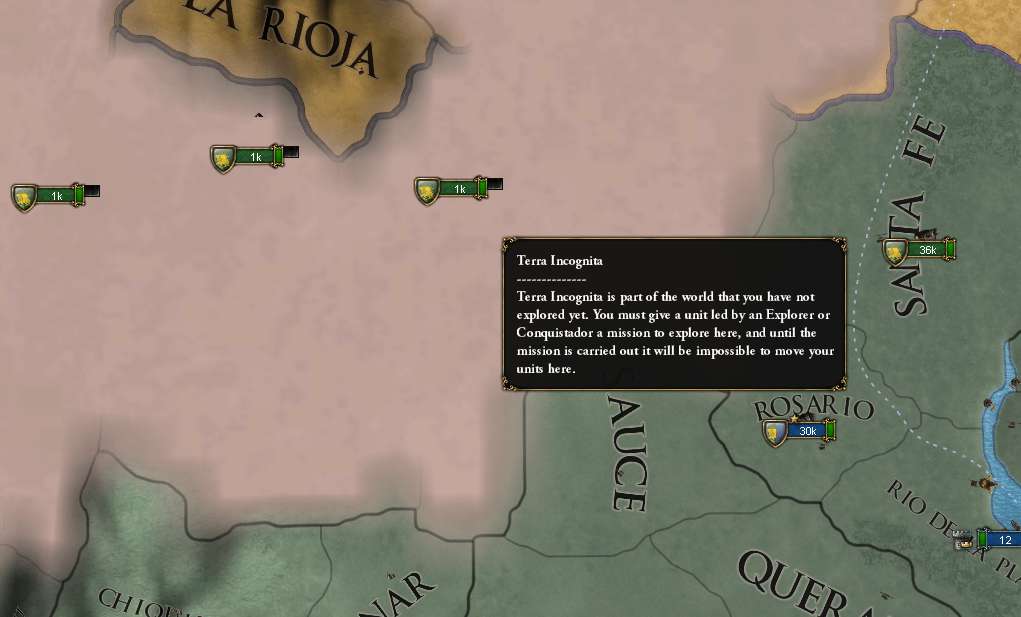次のSpain戦に備えて、部隊テンプレートから39kの部隊を右のSANTA_FE州で生産 →未知領域で生産は完了したが、SANTA_FEへの行き方が分からずExile(黒旗?)状態に 移動させることもできず、Spainと開戦後に36kの部隊がSpanish_La_Plata領に進入 →La_RIOJAまでのTerra_Incognitaを晴らす→1k×3部隊がSpanish_La_Plata領を通ってSANTA_FEに移動開始 自分の植民地国家の領土は問答無用でTerra_Incognitaが晴れて欲しい システム的にはともかく、不忠でもないのに植民地国家が国の形すら宗主国に伝えていない、というのは変だと思う