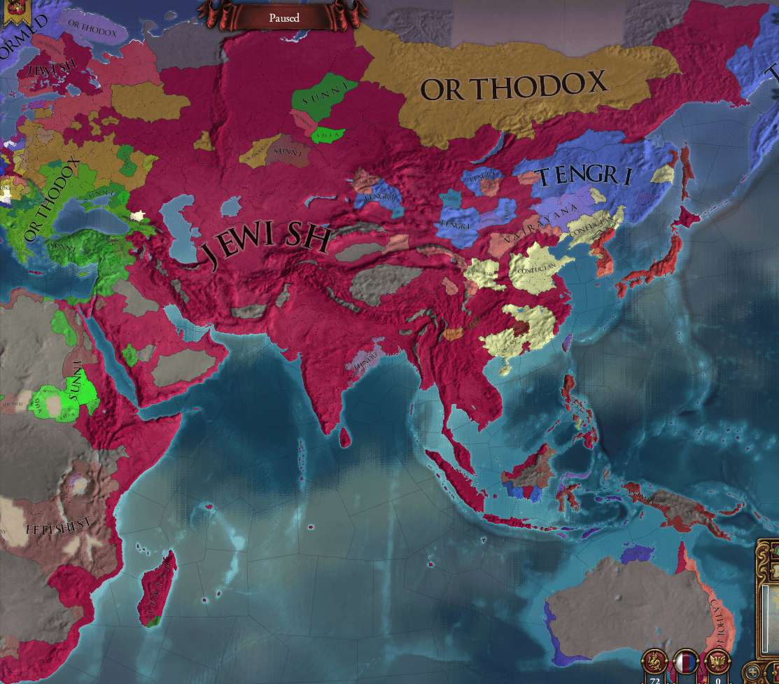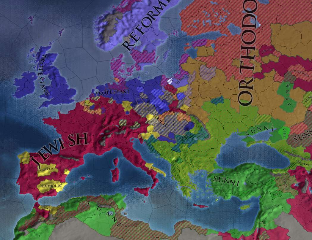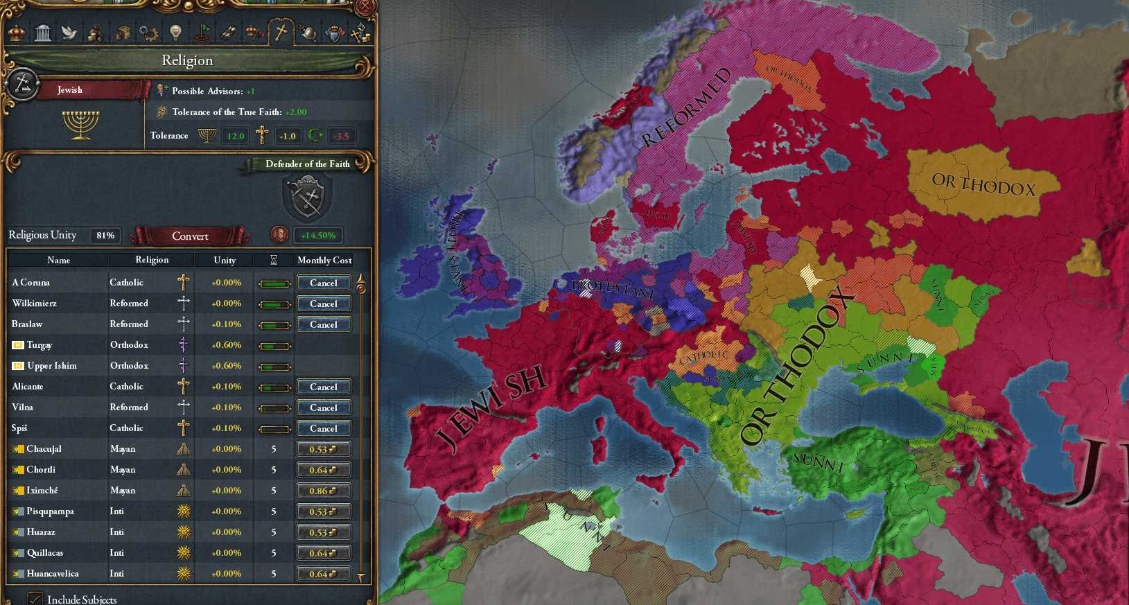 ADM不足で安定度を上げられず、国家布教強度が少し低下 この頃には自国領については大聖堂建築と同化が済んだ州しか改宗しなくなったため、1州あたり7~8か月