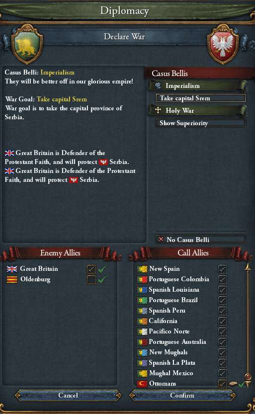 Great_Britainが信仰の擁護者アピール×2。誇り高い騎士の国だからかな? Ottomansは敵軍用ではなく、反乱鎮圧を肩代わりしてもらうために参戦してもらった