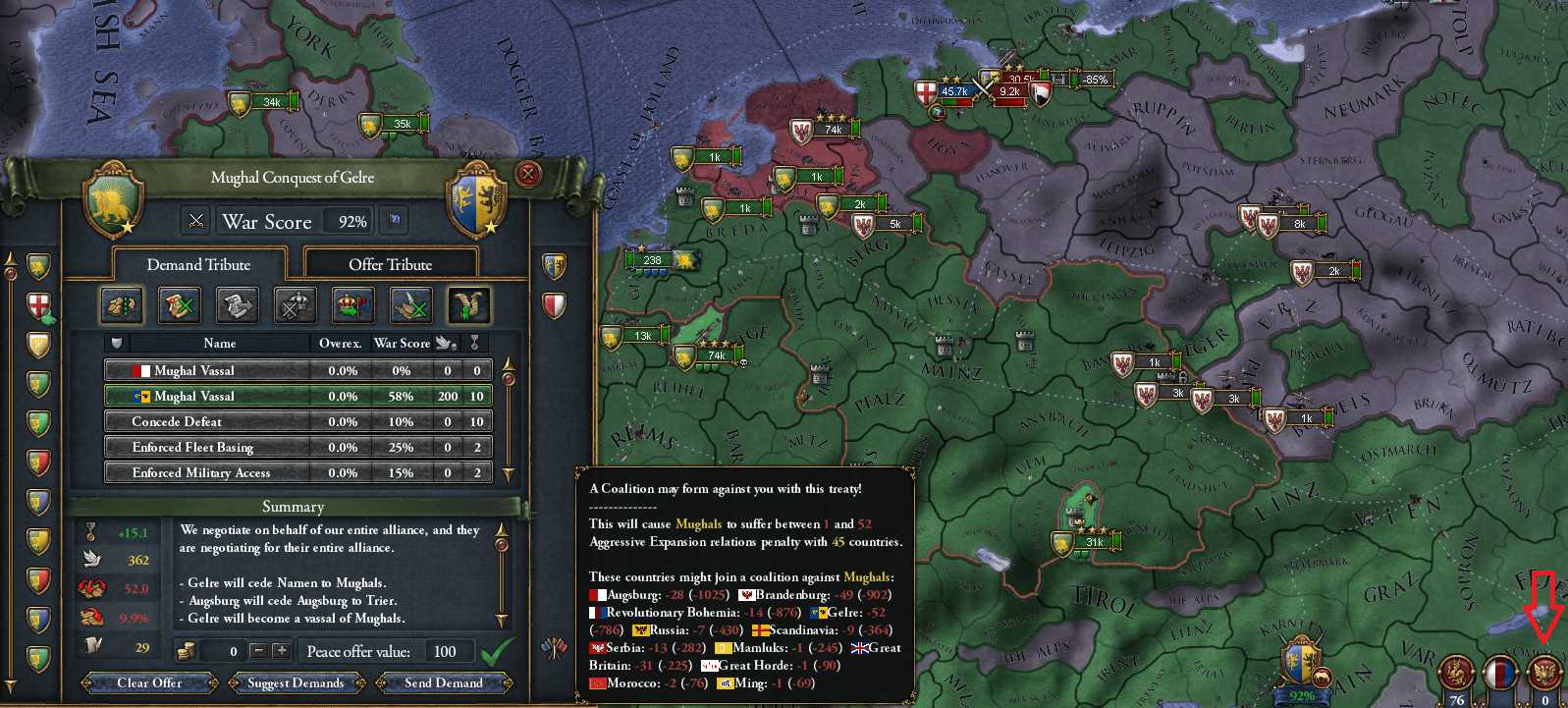 BrandenburgがGelreに攻め入っており優勢だった。Brandenburgが大きくなると解体が面倒なので開戦 この際不注意で征服CBのままになってしまい、他州の割譲にDIPが必要に
