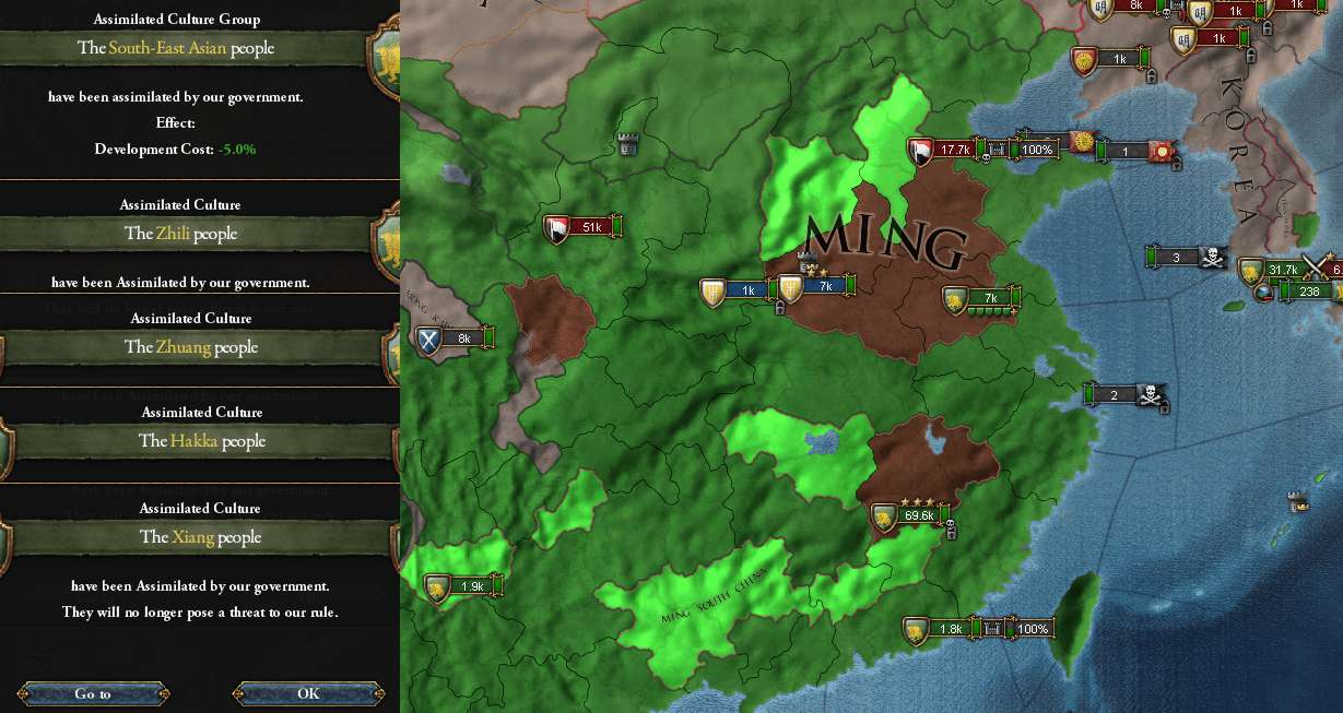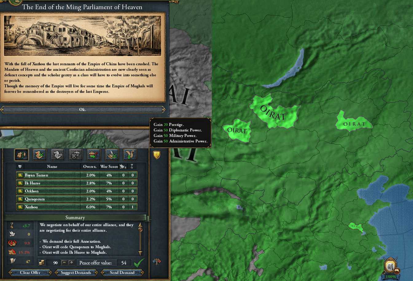 1766/10 Ryukyu終戦。Ryukyu完全併合、Ming割譲多数。ミッション1-8達成。25年間交易効率+20%、交易品生産量+10%