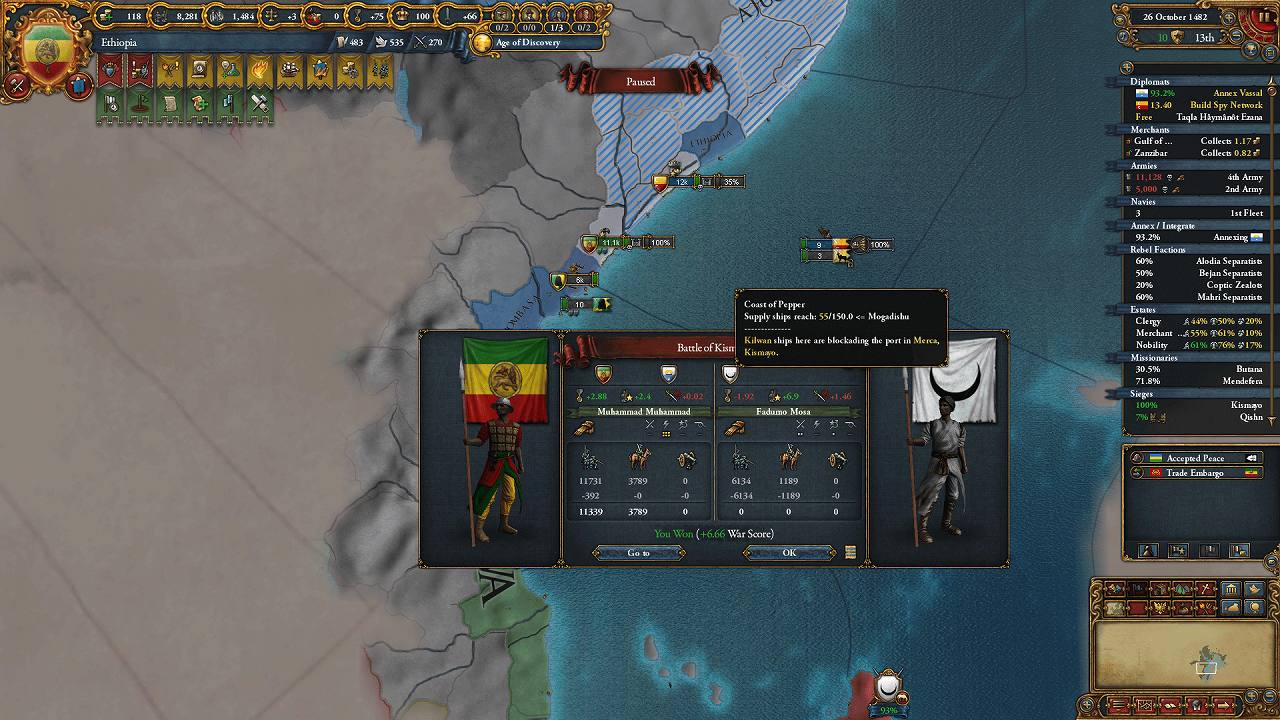 野戦でMombasa軍を全滅させたため、すぐ優勢に
