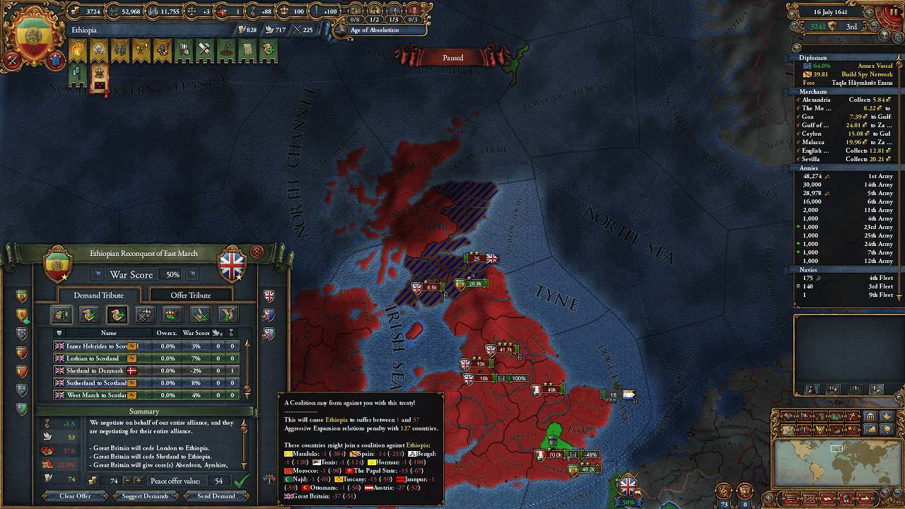 双方援軍なしで1年で終戦。戦中にScotland外交併合完了