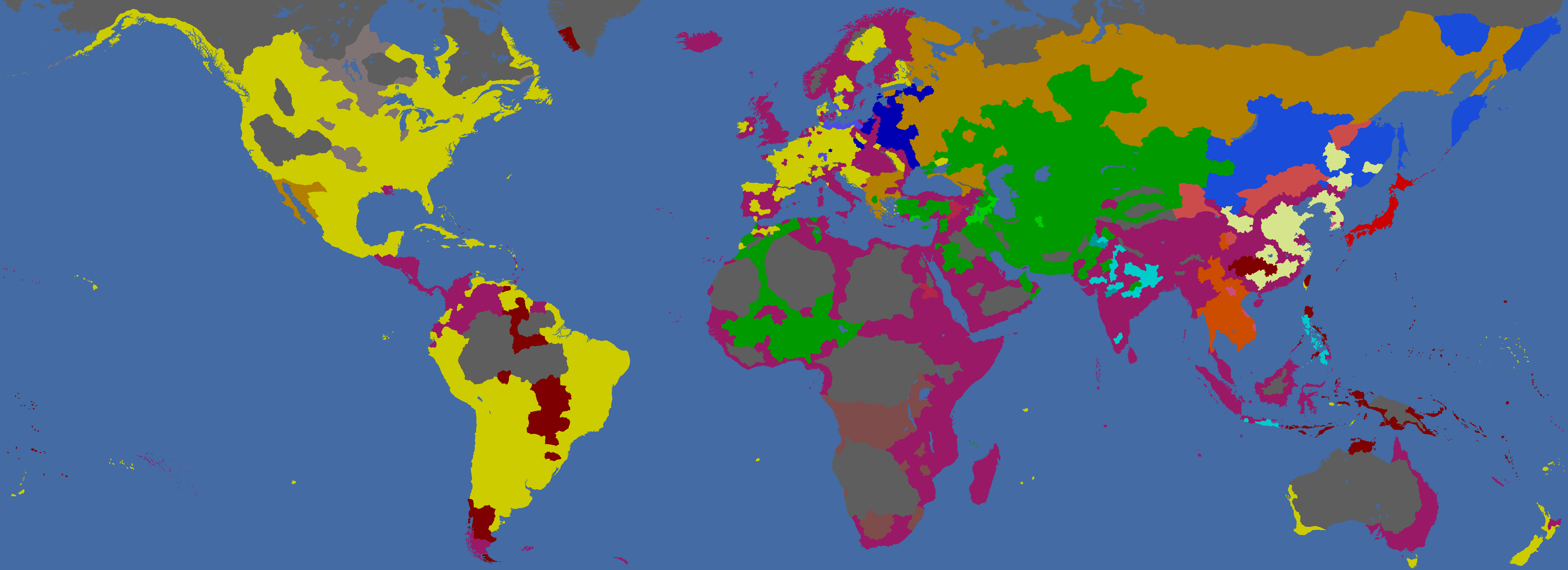 北米の明るい水色はUSA、中南米とオーストラリアの水色はエチオピアの植民地国家