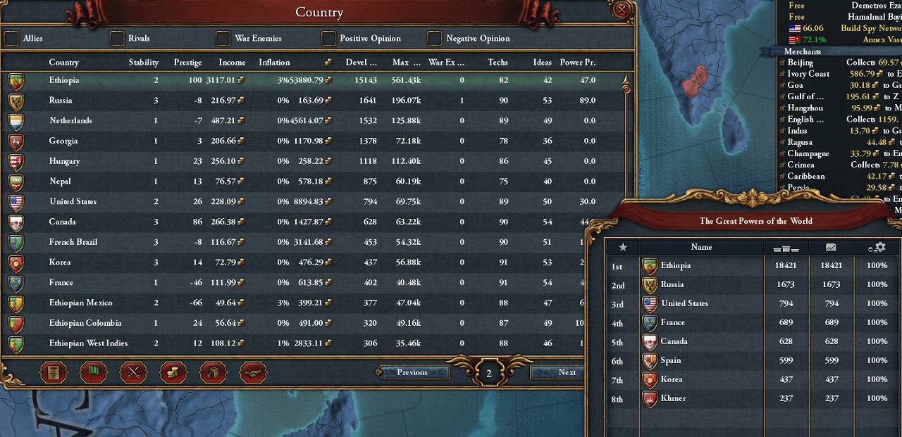 | Spain | 1782/09-1784/02 | Austria Spain | Tuscany Brandenburg | 2 | 新大陸に植民地国家追加、5.3.0の新帝 |