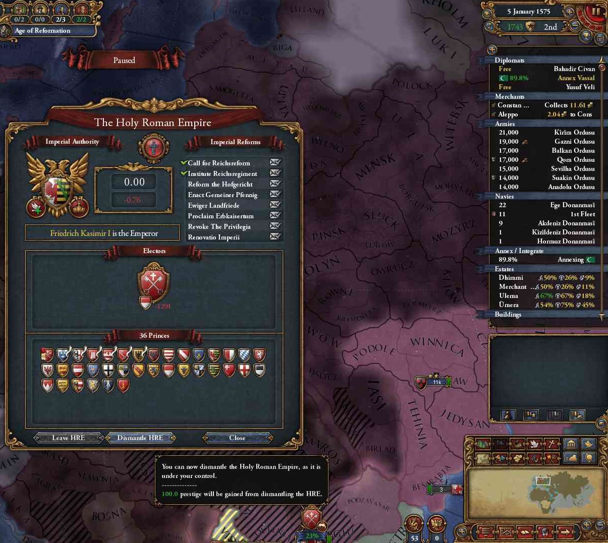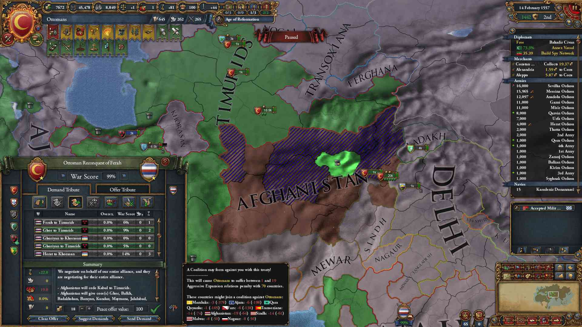 などで処分した。残った君主点はDevポチで使い切り、国庫に残っていた資金でTimurids等の借金を肩代わりした