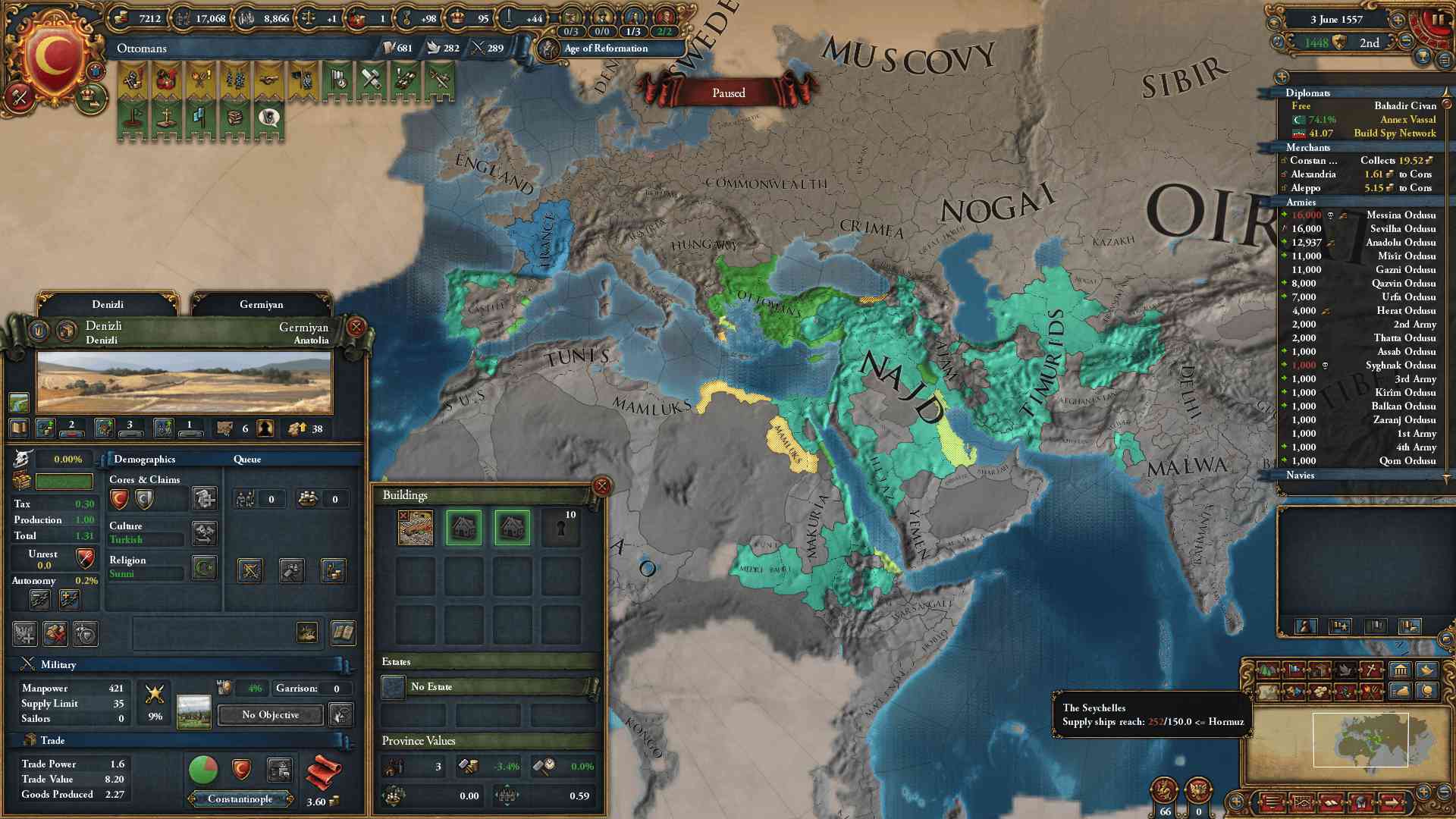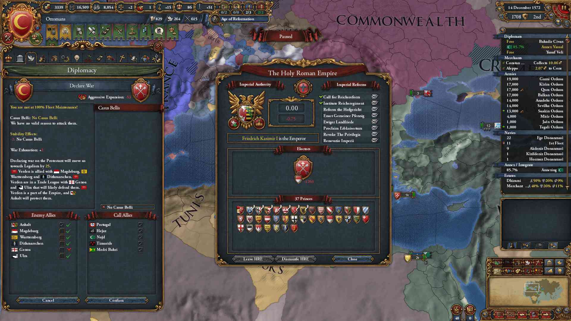 邪魔が入らないうちにOttomansに宣戦布告(Ottomansがユニットを作成する前に占領するため、隣接州で傭兵を生産中)