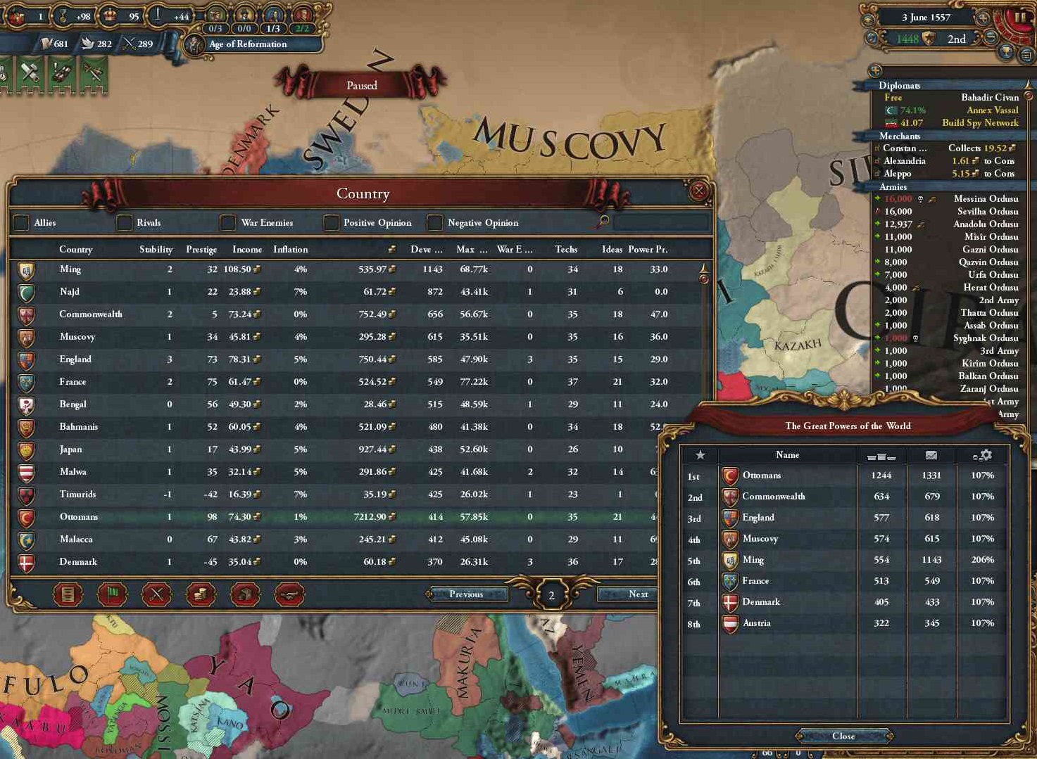 次男(Timurids)も親より大きくなった。今回の世界線ではOttomansがおかしな挙動(東欧放置でイベリア勢妨害)をした結果、 Commonwealthが絶好調でMuscovyはRussiaに変態できておらず、一方で新大陸はEnglandの天下になっている。 アジアに目を向けるとMingが健在でインドは寡占が進みつつあり、Malaccaが地域大国として高収入を誇っている