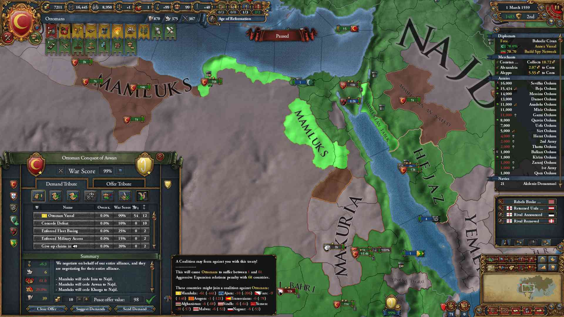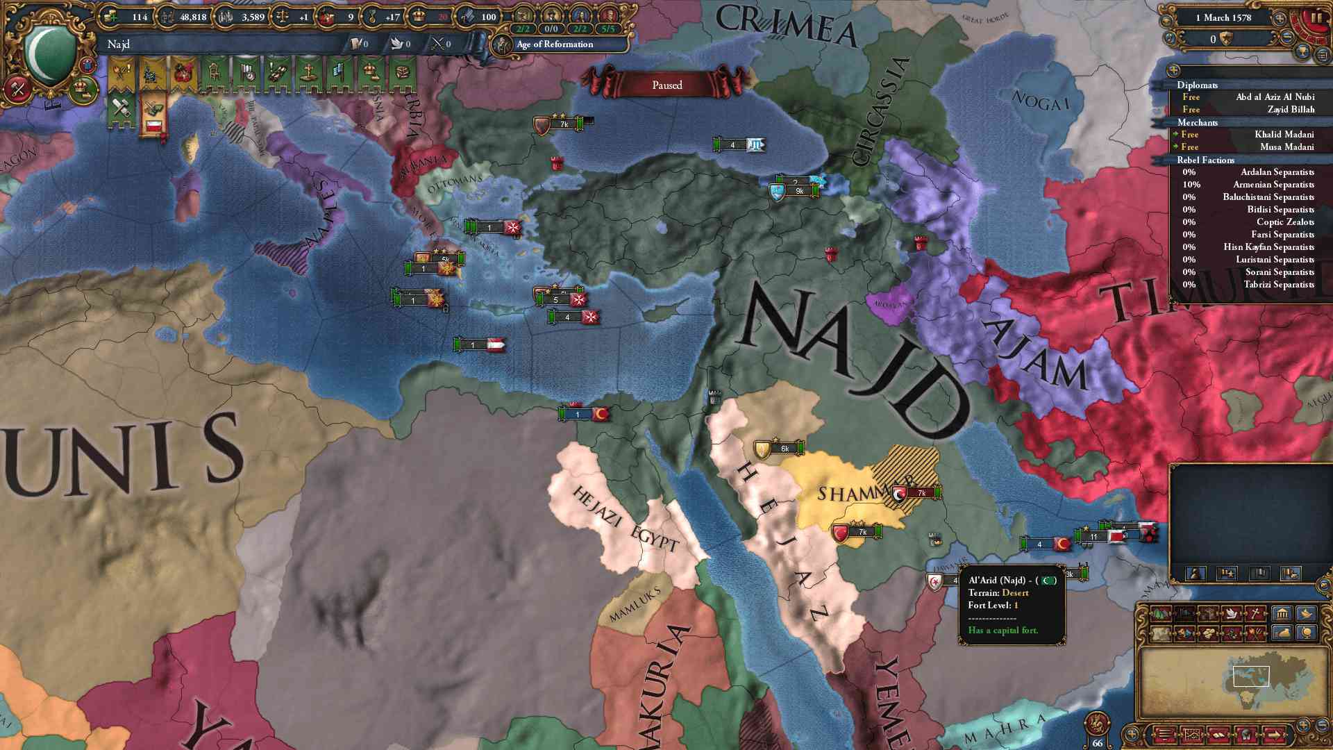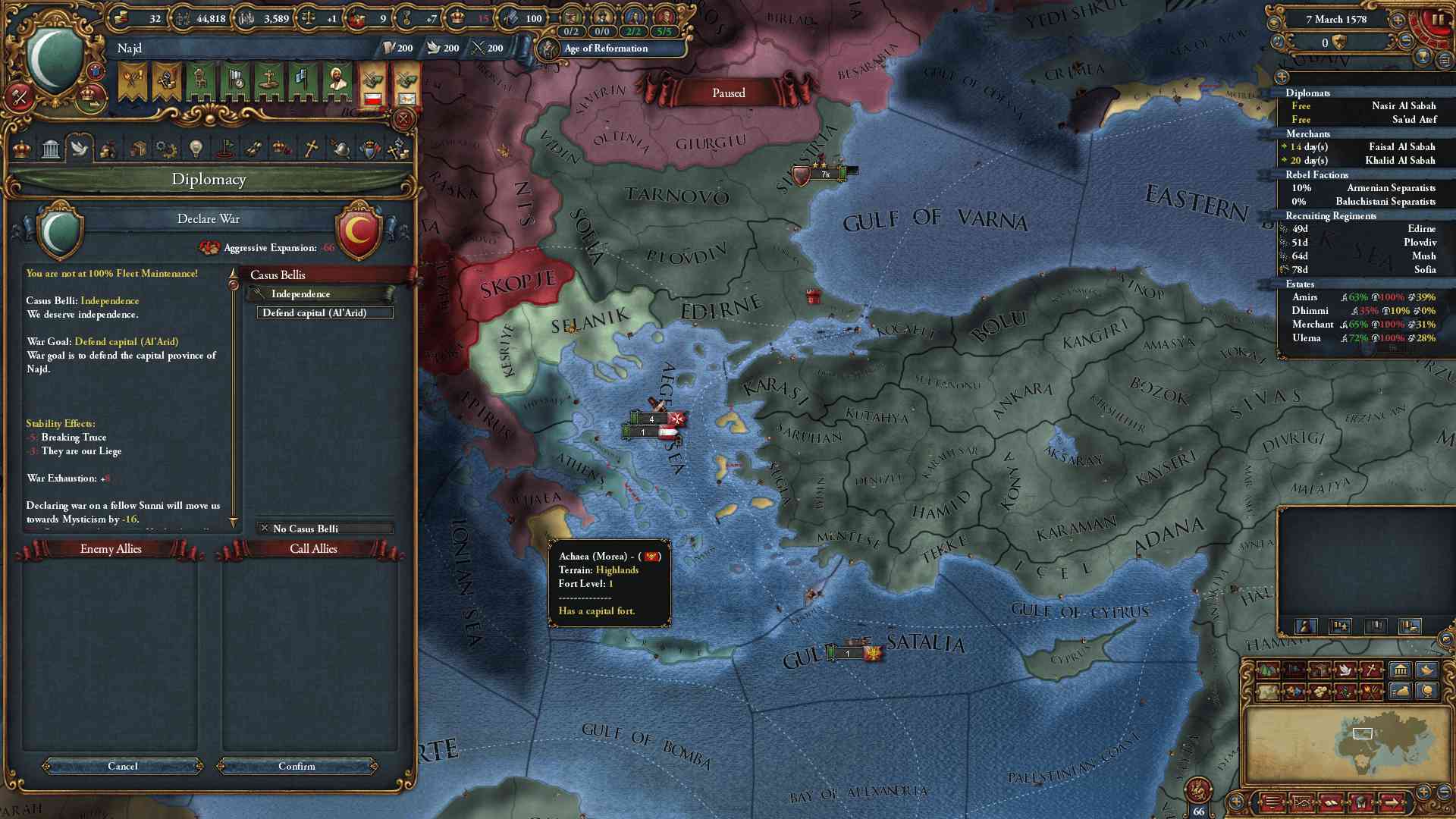 後から思えばどこでも良いので独立支援を頼んでおけば良かった。Ottomansの間にヘイトを貯めておいたので、候補は多かったと思う Ottomans戦はNajdのみで問題ないが、同盟が居ればその後の(宗主国Najdに対する)独立戦争を遅らせることができたかもしれない