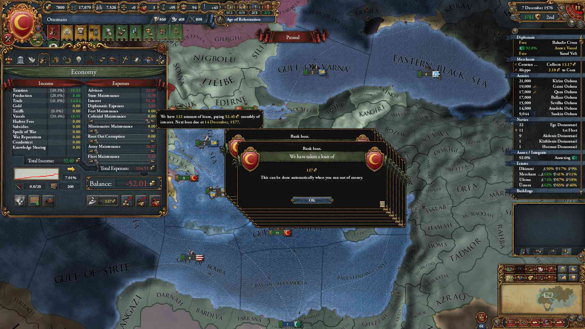 首都移転後しばらくしてから収支が赤字になり始めた。直轄領の減少にも拘らず陸軍部隊を解雇しなかった(独立欲求対策)ので仕方ないと思っていたが、 首都を移転した際に交易首都(SELANIKはRagusaノード)も移ってしまったため、コンスタンティノープルでの徴収が減少して交易収入が低下していた 投了後にSSを確認している時に気付いた。相変わらずのドジっぷりである