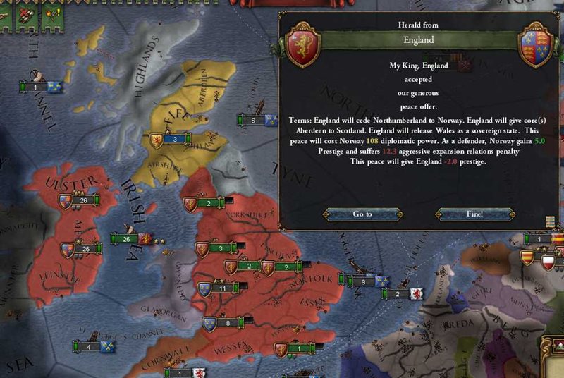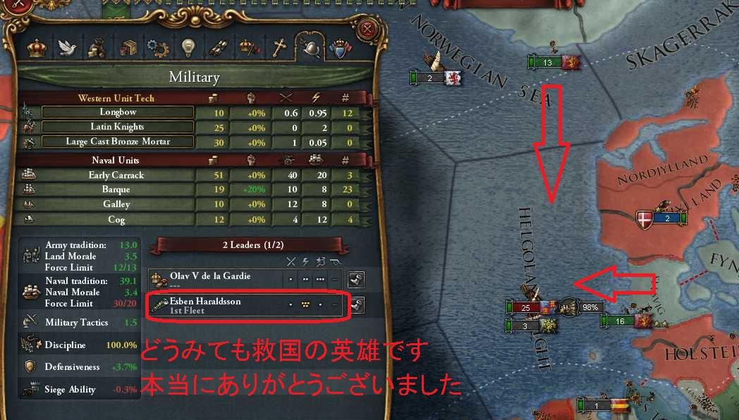 バトル オブ ヘルゴラント イングランドはこの時点で伝統の『海軍士気+20%』と1つ目の固有NIで『重装船戦闘力+10%』を獲得しており既に海なら最強だが、 ノルウェーも伝統の『小型船戦闘力+20%』と2つ目の固有NIで『海軍士気+20%』を解放しており、実はなんと士気は拮抗している。