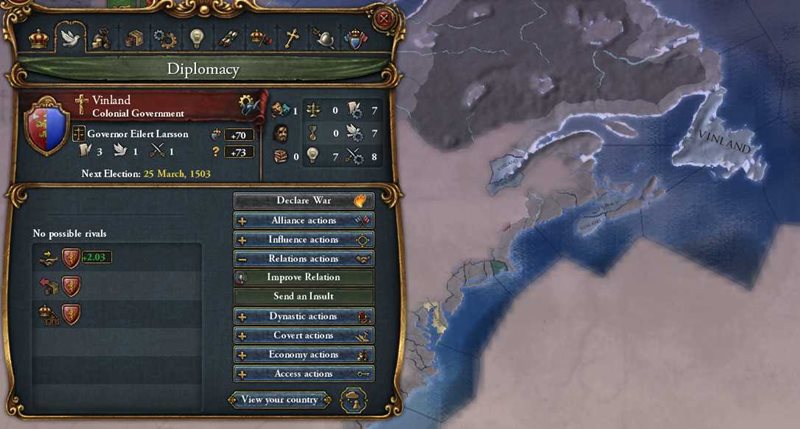 予定通り1479年に外交LV7に到達し、同年ニューファンドランド島に初めての入植地を得る。 およそ500年ぶりにヨーロッパ人はここへ帰ってきた!