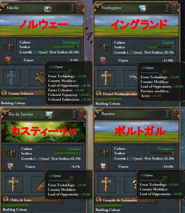ノルウェーだけ100年先の入植レベルである。これに入植者4人+2箇所の計6箇所の入植地を常時維持するようにしつつ、5年ごとにきちんと入植ミッション*3の更新に努めている。