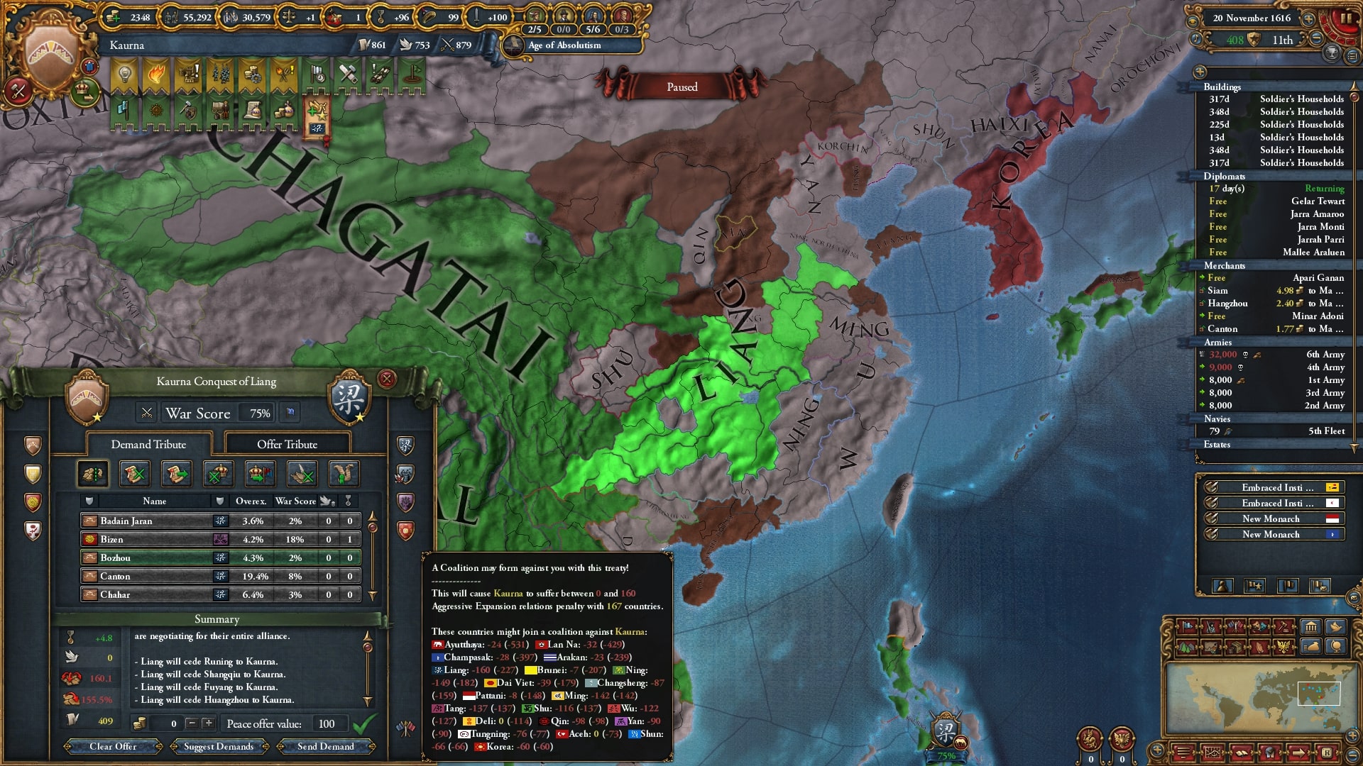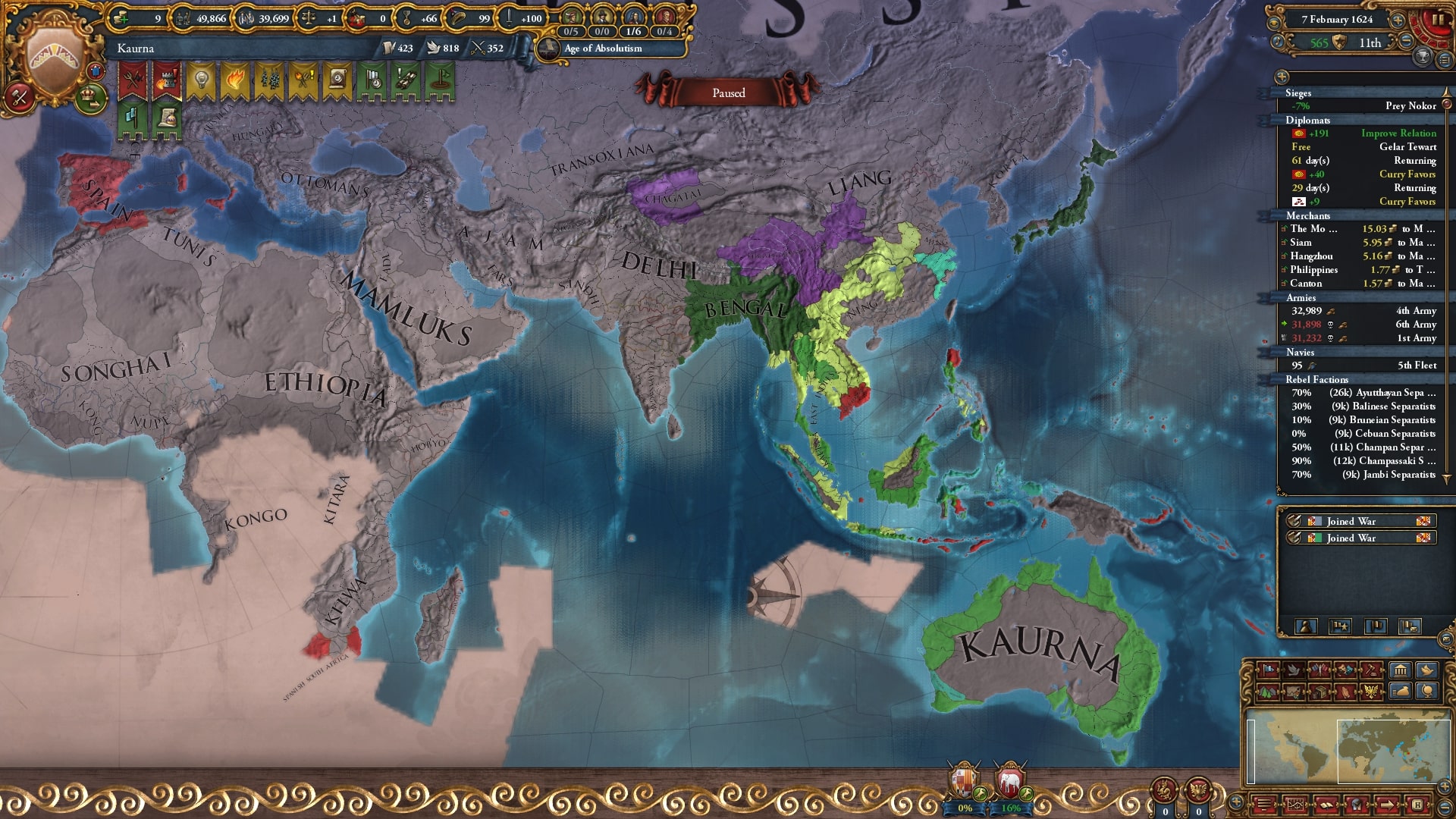 マラッカ撃破の流れでアユタヤ撃破、東南アジアの大陸部に進出。ベンガルやチャガタイと同盟しスンニ側のAEを抑え、東アジアは全国家殴るのでAEは無視します。
