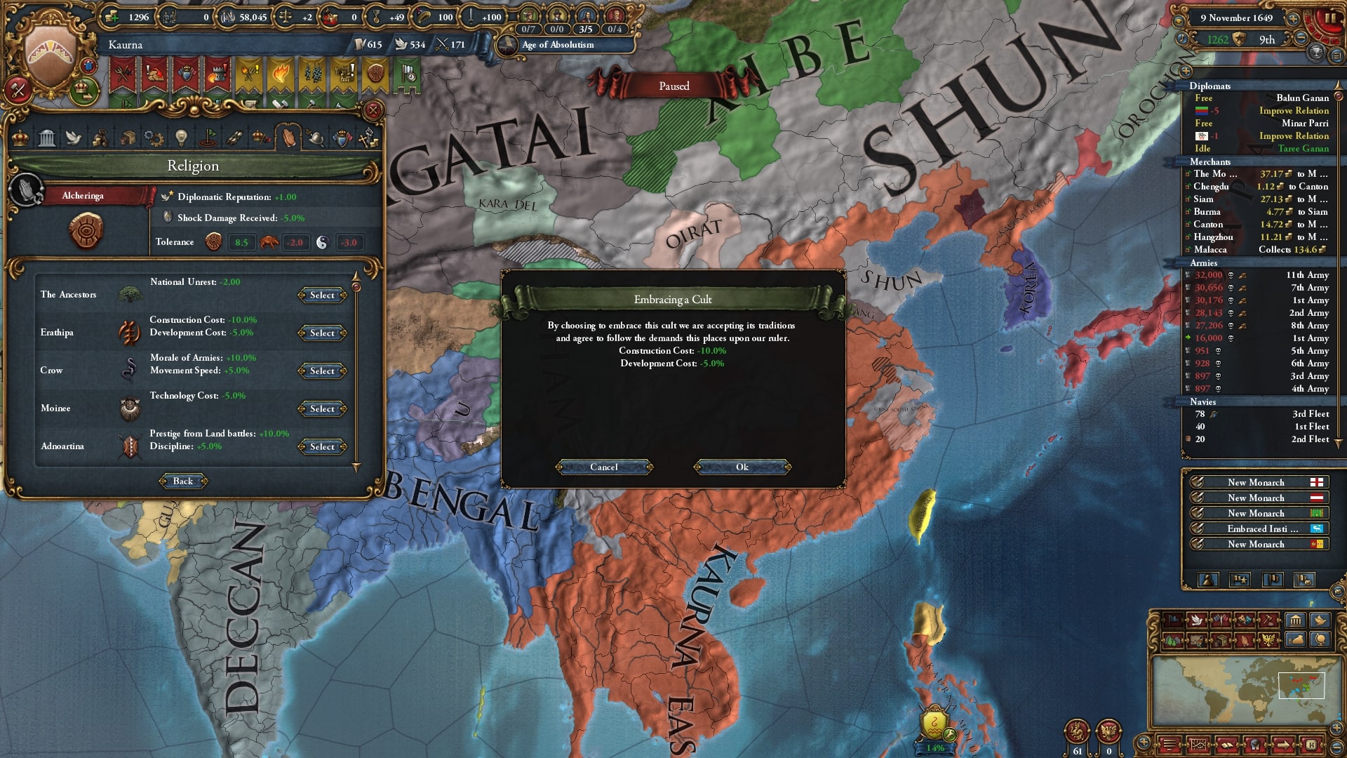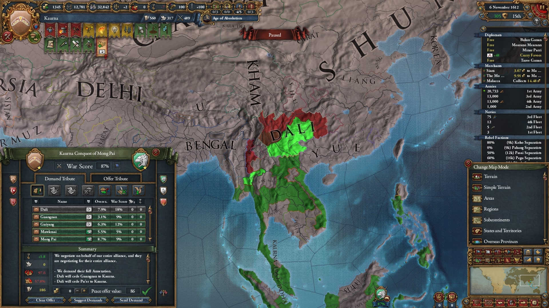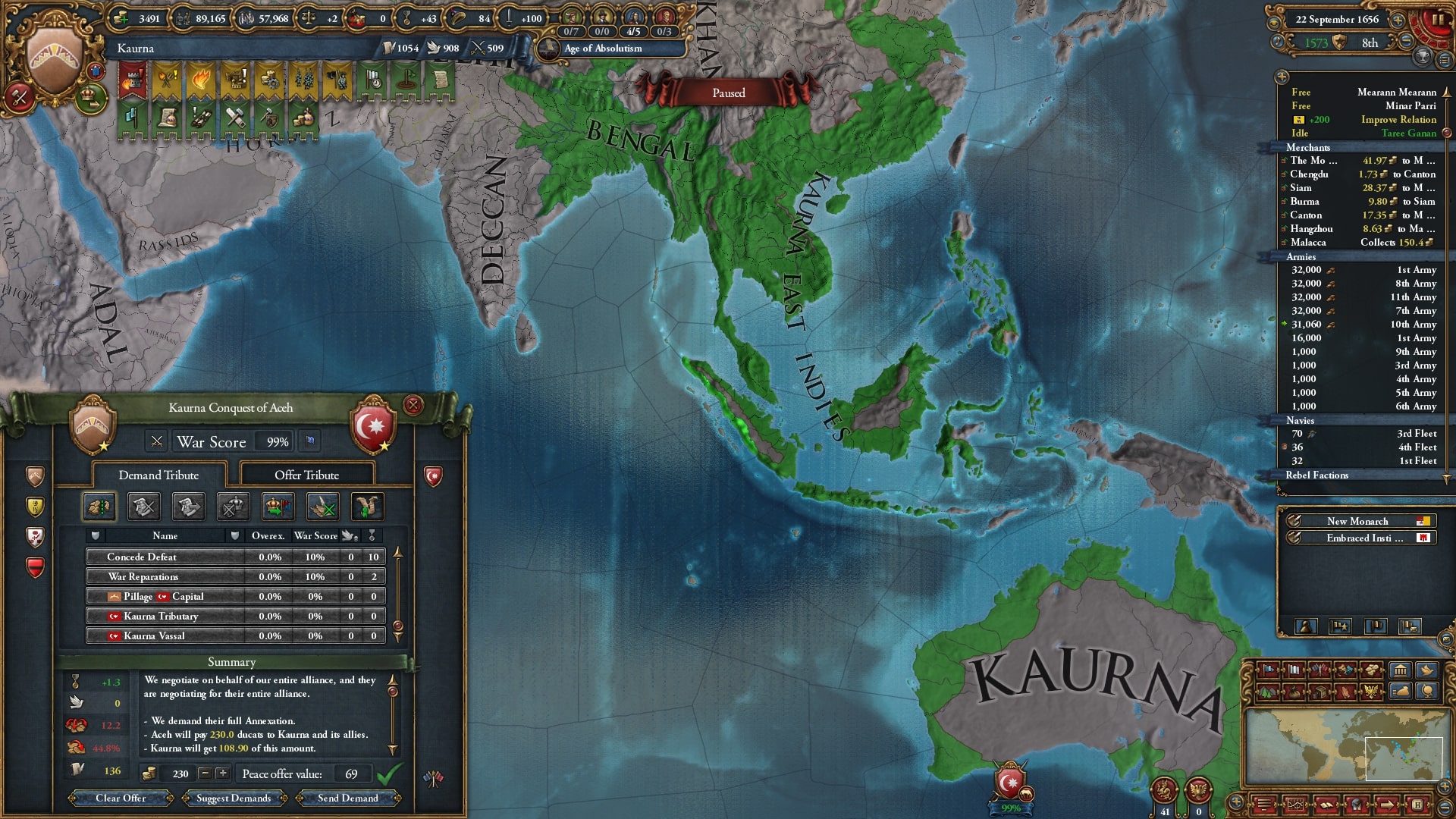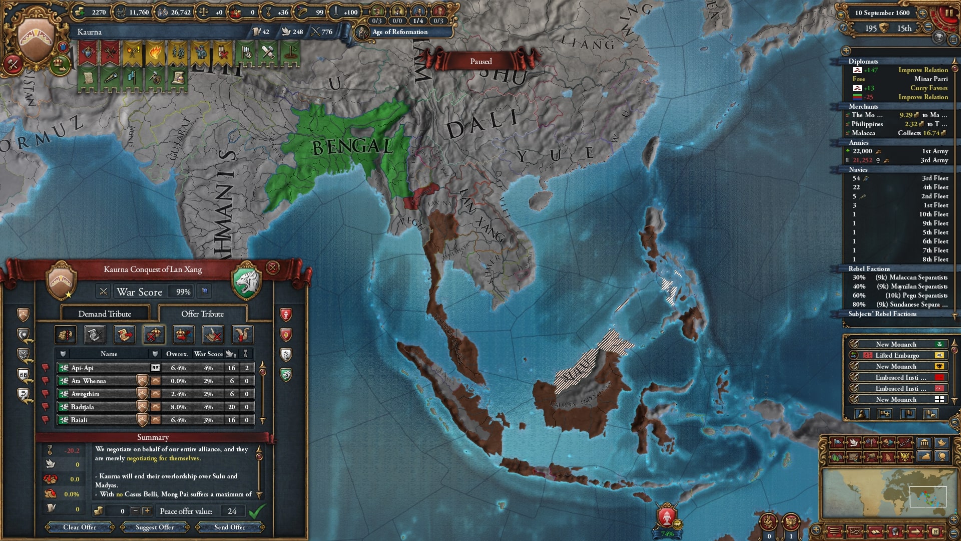 欠かさず小国を併合。モンナイ/Mong Nai相手に負け講和をしてスンニ派に再改宗した属国アチェを解放しています。